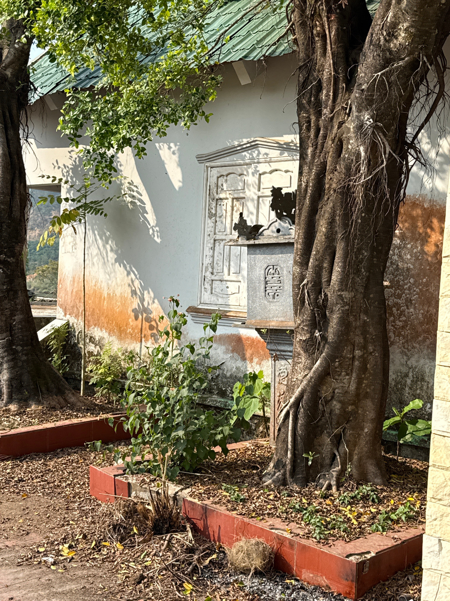 A medium shot, rotated 90 degrees counterclockwise, shows a weathered building with white walls and a gray gravestone structure, partially obscured by a large tree. The tree, with its thick, dark-brow…read more