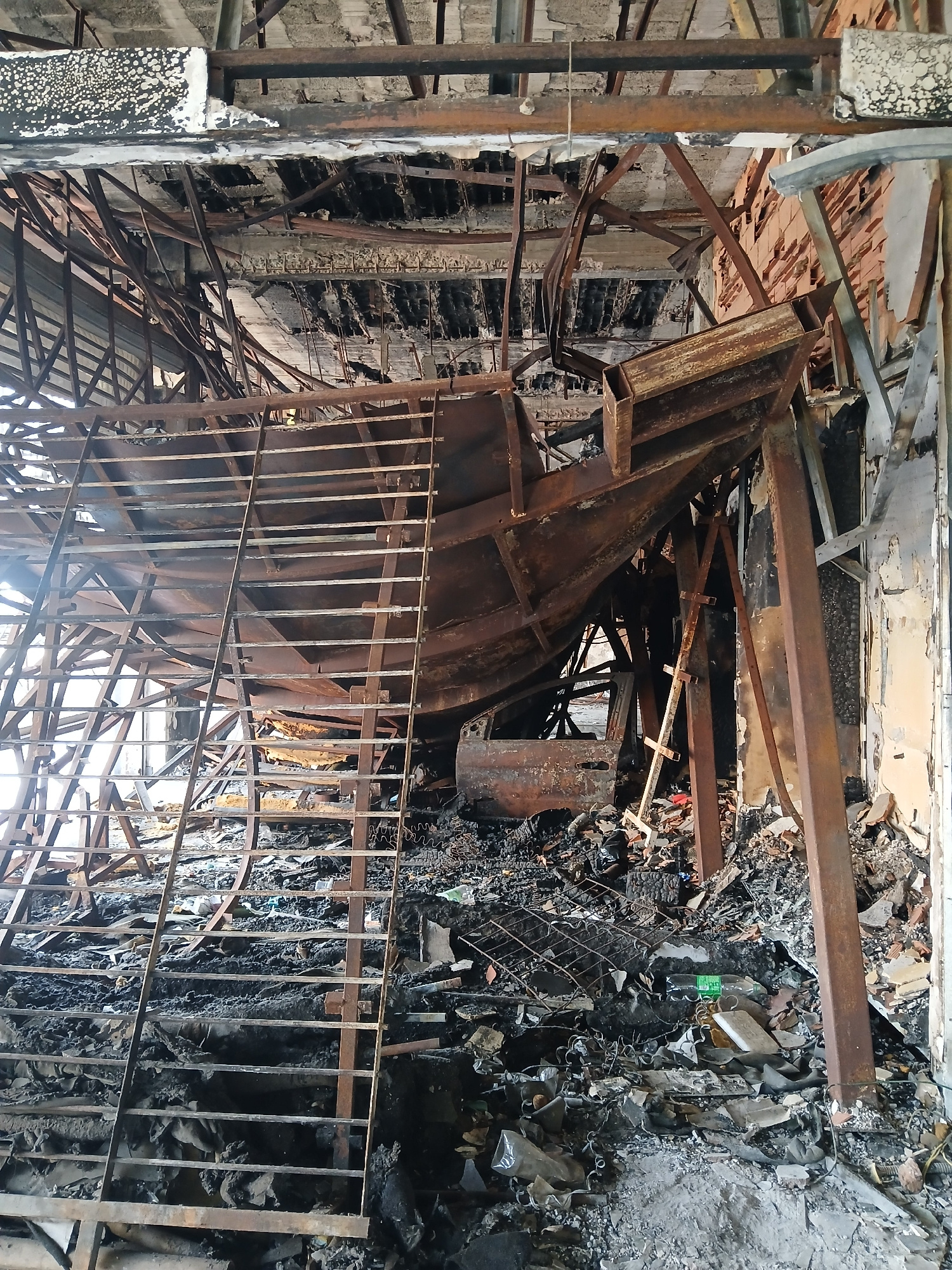 The image depicts the interior of a severely fire-damaged structure. Twisted and charred metal debris, including support beams and remnants of a staircase or railing, are scattered throughout the scen…read more