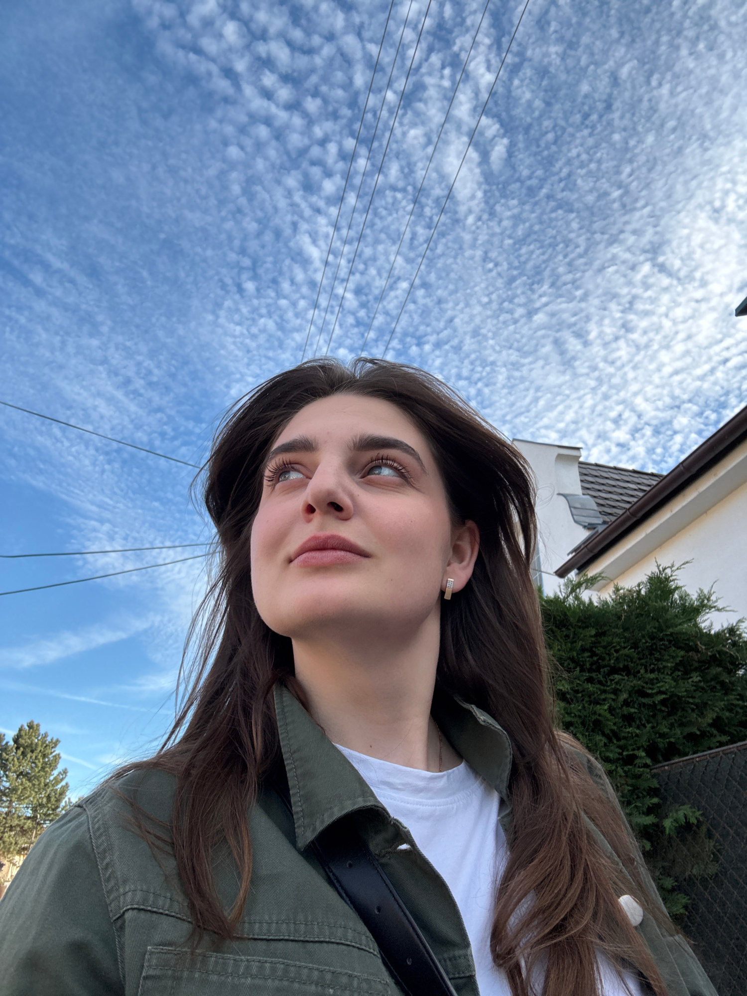 A young woman with long, dark hair is the primary subject of this image, captured from a low, upward angle. Her face, featuring light-colored eyes and a neutral expression, is turned slightly to her r…read more