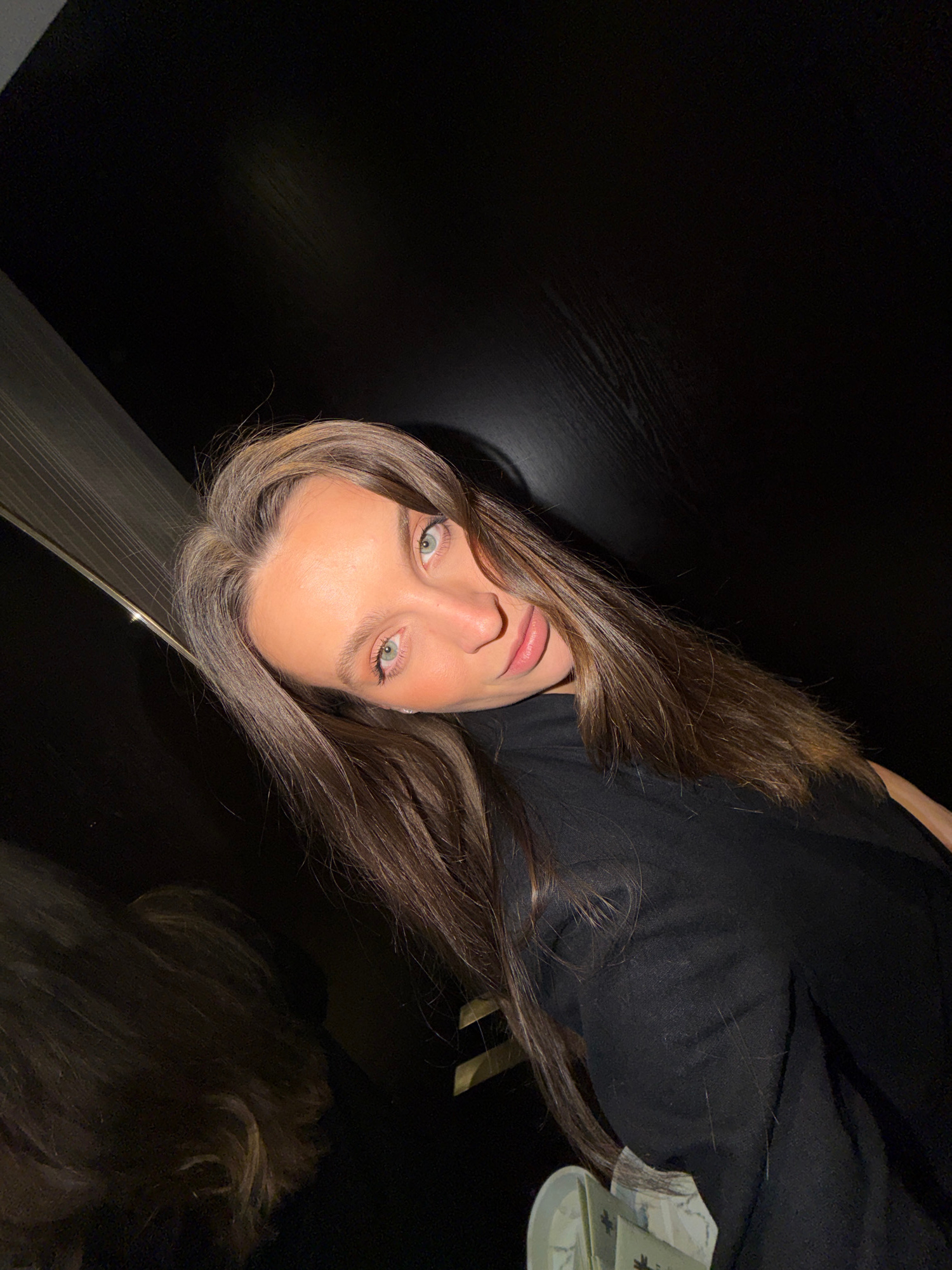 A woman with long brown hair and light-colored eyes is centered in the frame, looking directly at the camera. She is wearing a black shirt. The background is predominantly dark, suggesting an indoor s…read more
