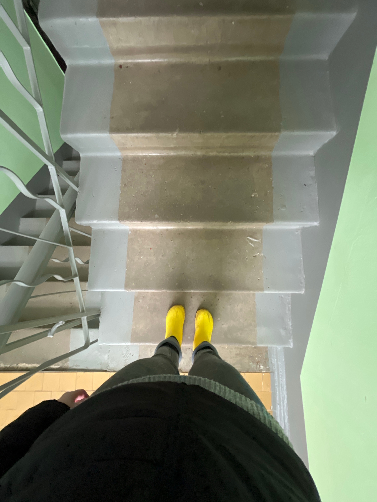 The photo, taken from above, shows a person wearing yellow rain boots descending a concrete staircase inside an apartment building. The staircase has white-painted edges with beige treads and risers.…read more