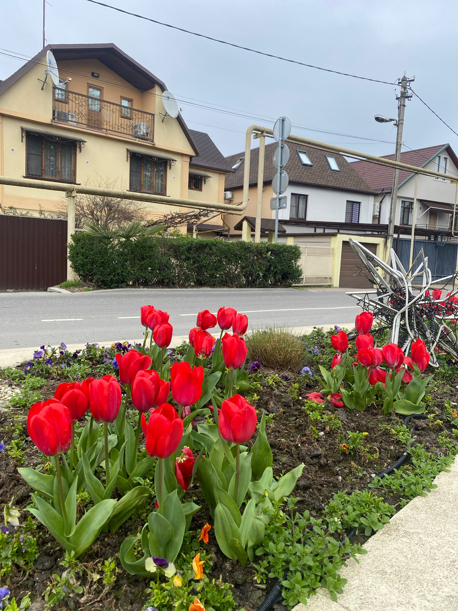 The image displays a residential street in Sochi, Russia, under an overcast sky. In the immediate foreground, a flower bed with dark soil is populated by numerous red tulips in various stages of bloom…read more
