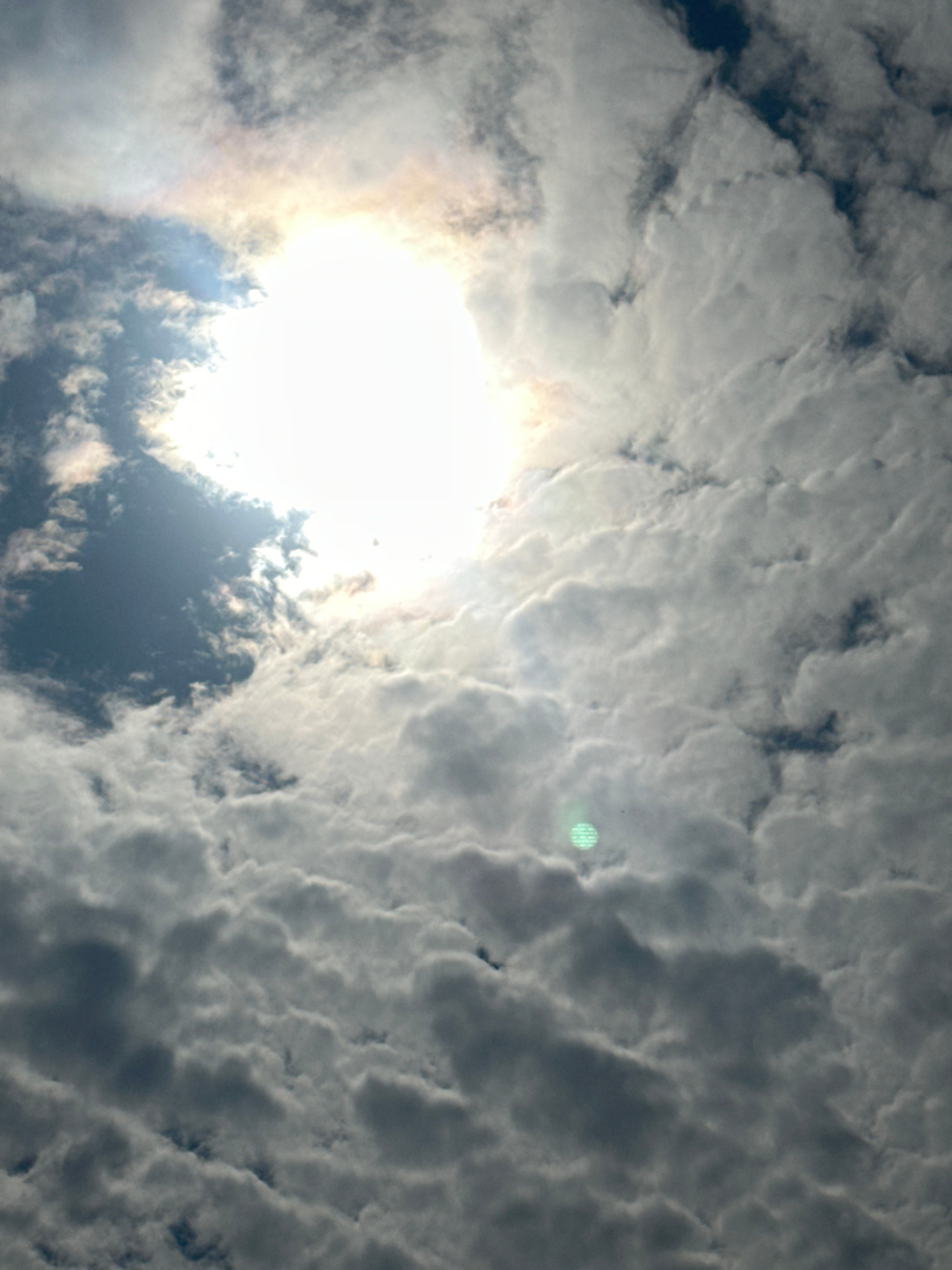 The image captures a dense, textured cloudscape, with the sun partially breaking through on the left side, casting a strong, overexposed glare. The clouds range from bright white where illuminated by…read more