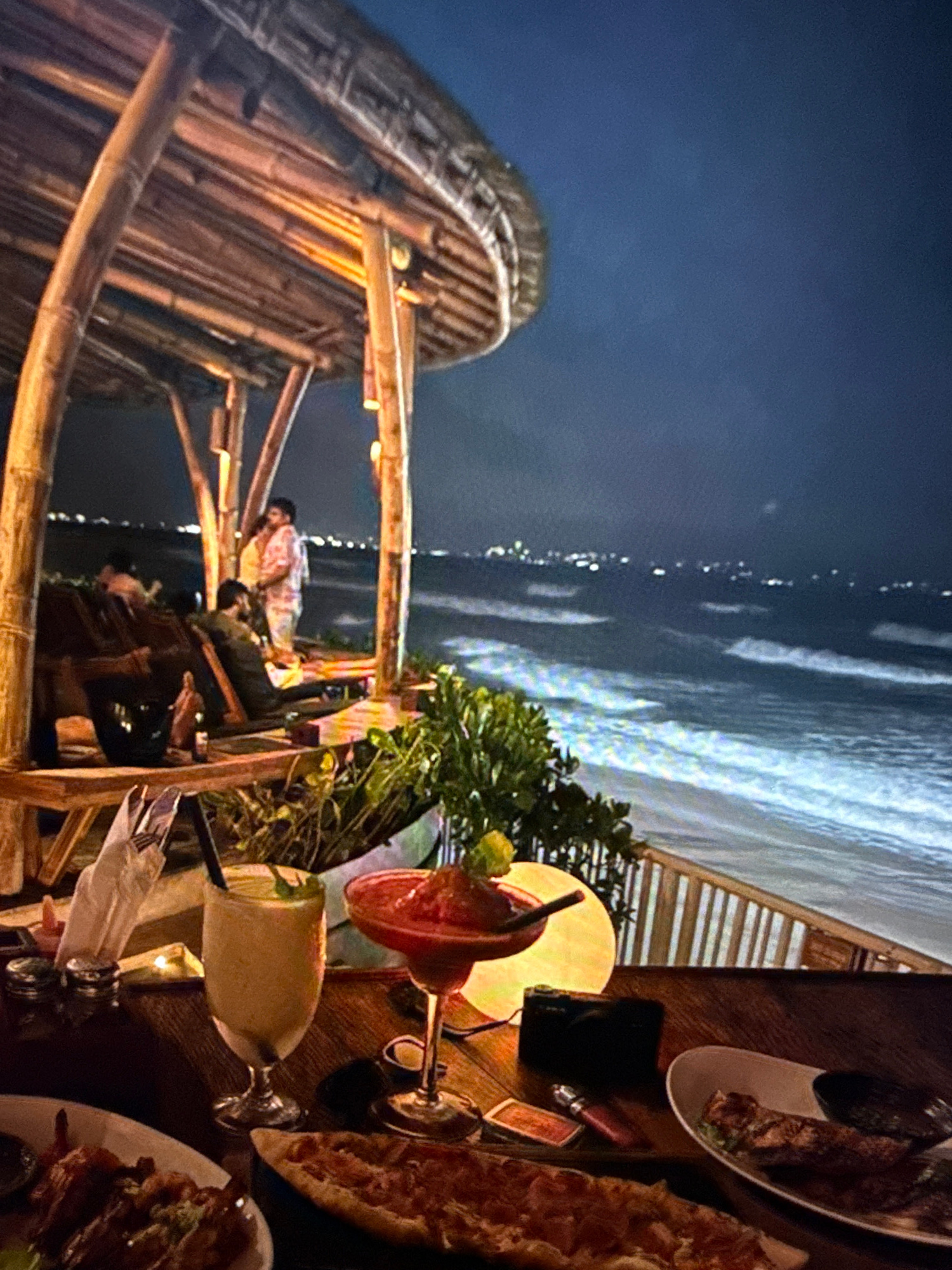 Here is a description of the image: The image shows an outdoor dining experience at a restaurant with a bamboo structure, likely located in North Kuta, Indonesia, given the ocean view and style of ar…read more