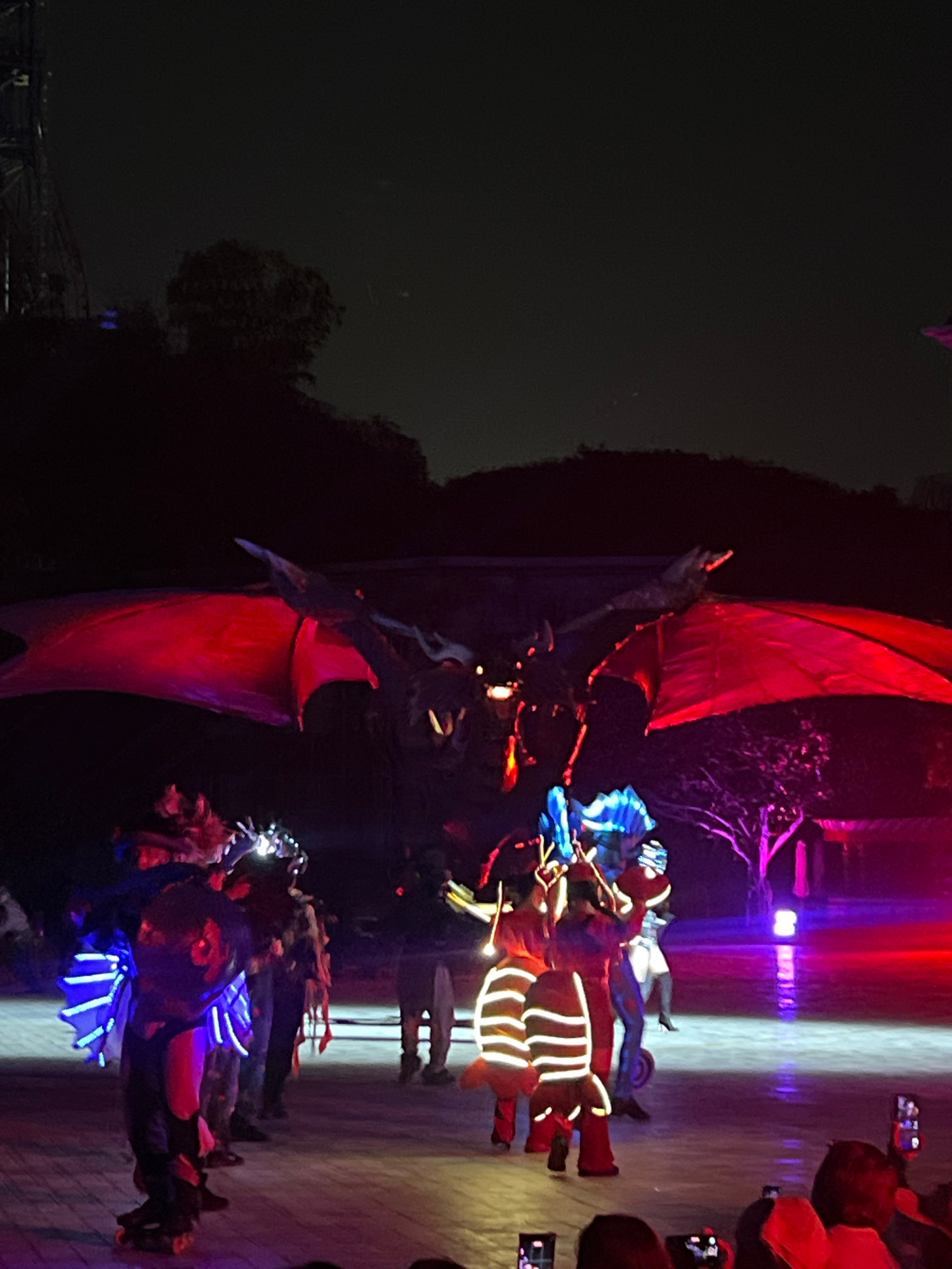 The image shows a performance in Nha Trang, Vietnam. A large red structure with protruding branches is visible to the left. To the right, there are people in costumes with lights. Some of the costumes…read more