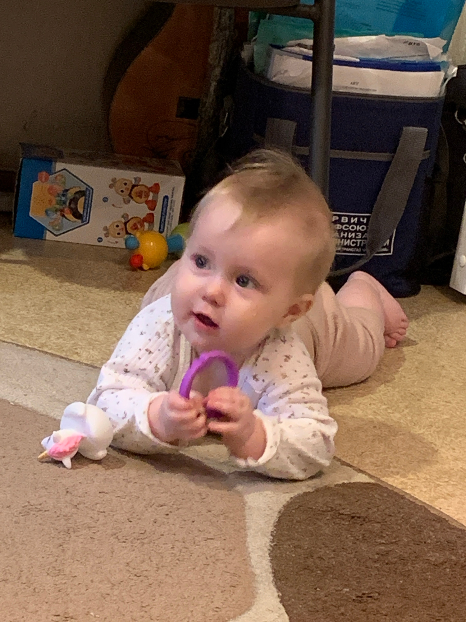 A baby lies on a carpet, partially tan with a brown accent. The baby wears a long-sleeved white shirt with small patterns and light pink pants. The baby holds a purple ring-shaped toy. A box with cart…read more