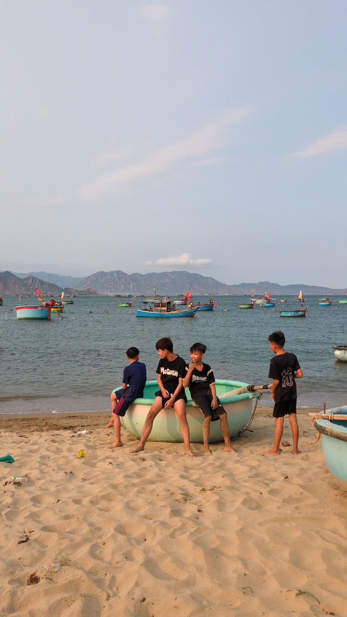 Captured in Phan Rang – Tháp Chàm, Vietnam, the photograph depicts a beach scene. Four young males are interacting with a teal boat on the sandy shore. One stands beside the boat, while the other thre…read more