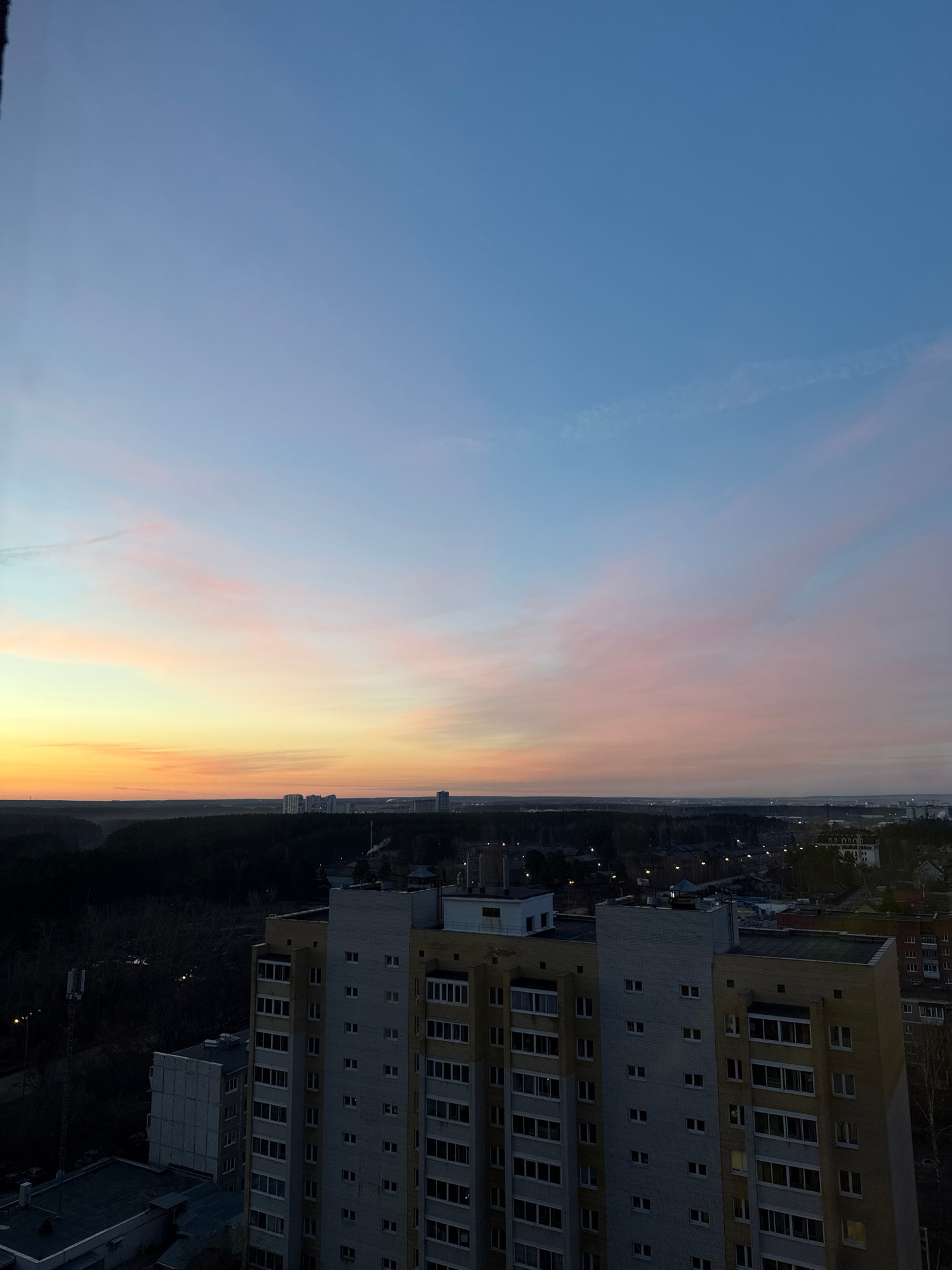 The image shows a high-angle view of Yekaterinburg, Russia, likely taken from a tall building. The sky transitions from blue to orange and yellow hues, indicative of sunrise or sunset. The horizon is…read more