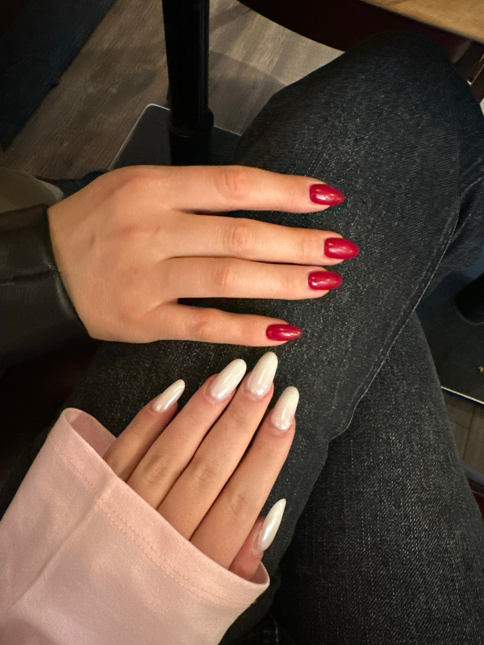 Two hands rest on dark denim-clad legs. The left hand displays short, almond-shaped nails painted a glossy red. The right hand features long, tapered nails with a pearlescent white finish. A soft pink…read more
