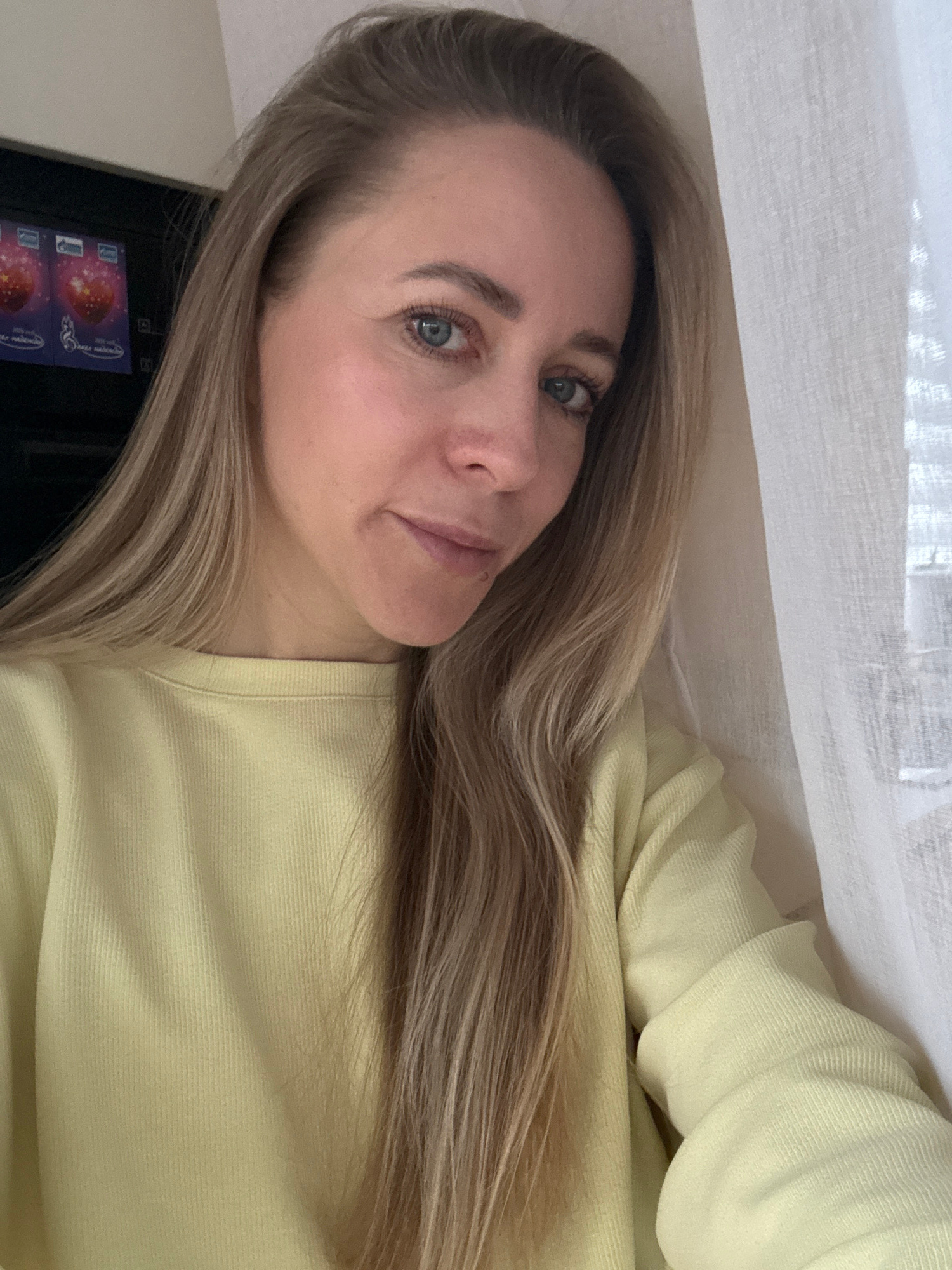 A woman with light blonde hair and blue eyes is facing the camera. She is wearing a light yellow sweater. A white fabric is draped above her. In the background, there is a black object with a colorful…read more