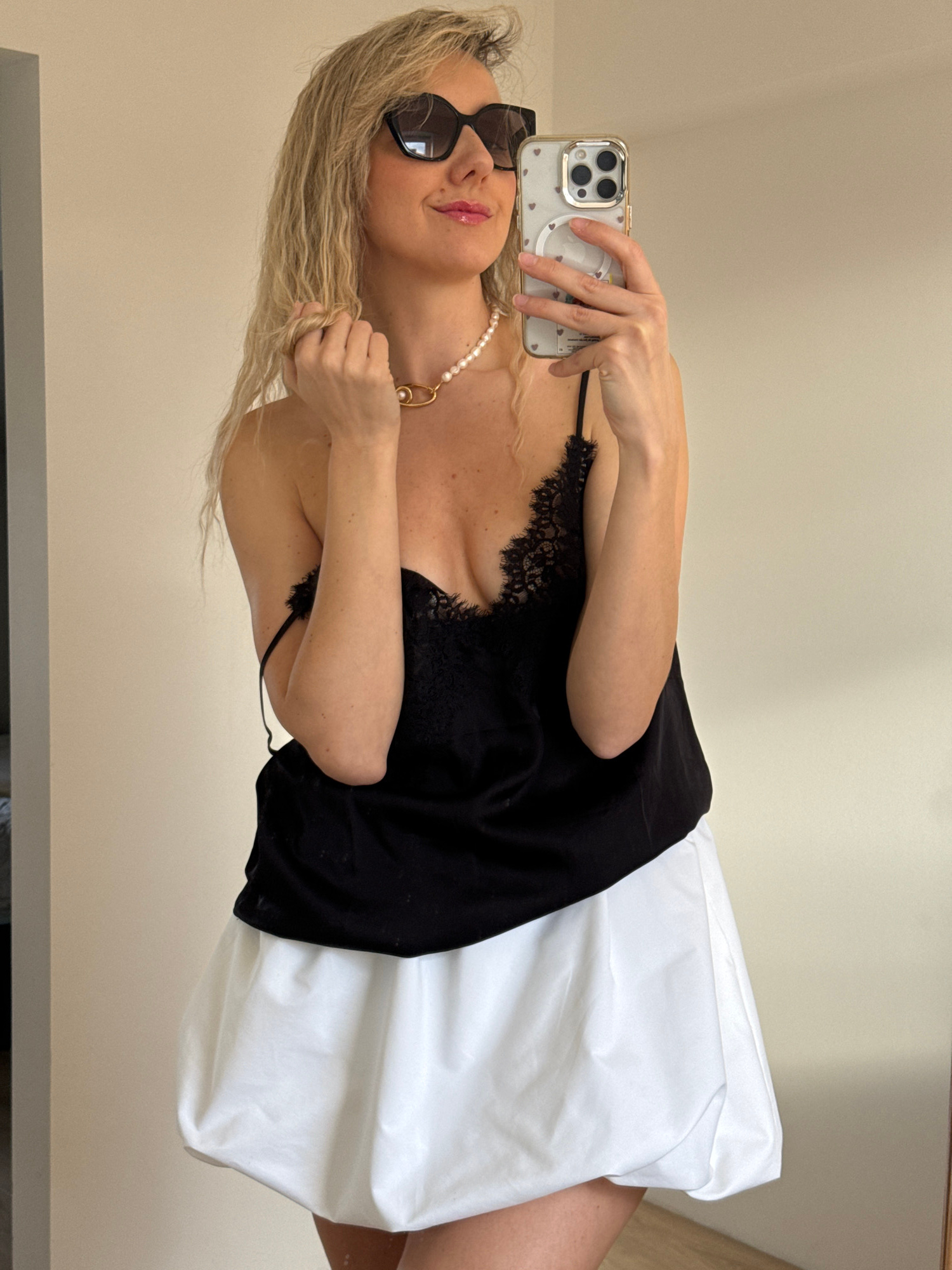 A blonde woman wearing sunglasses and a pearl necklace is holding a cell phone and taking a selfie indoors. She is wearing a black top with lace details and a white skirt. The location is undetermined…read more