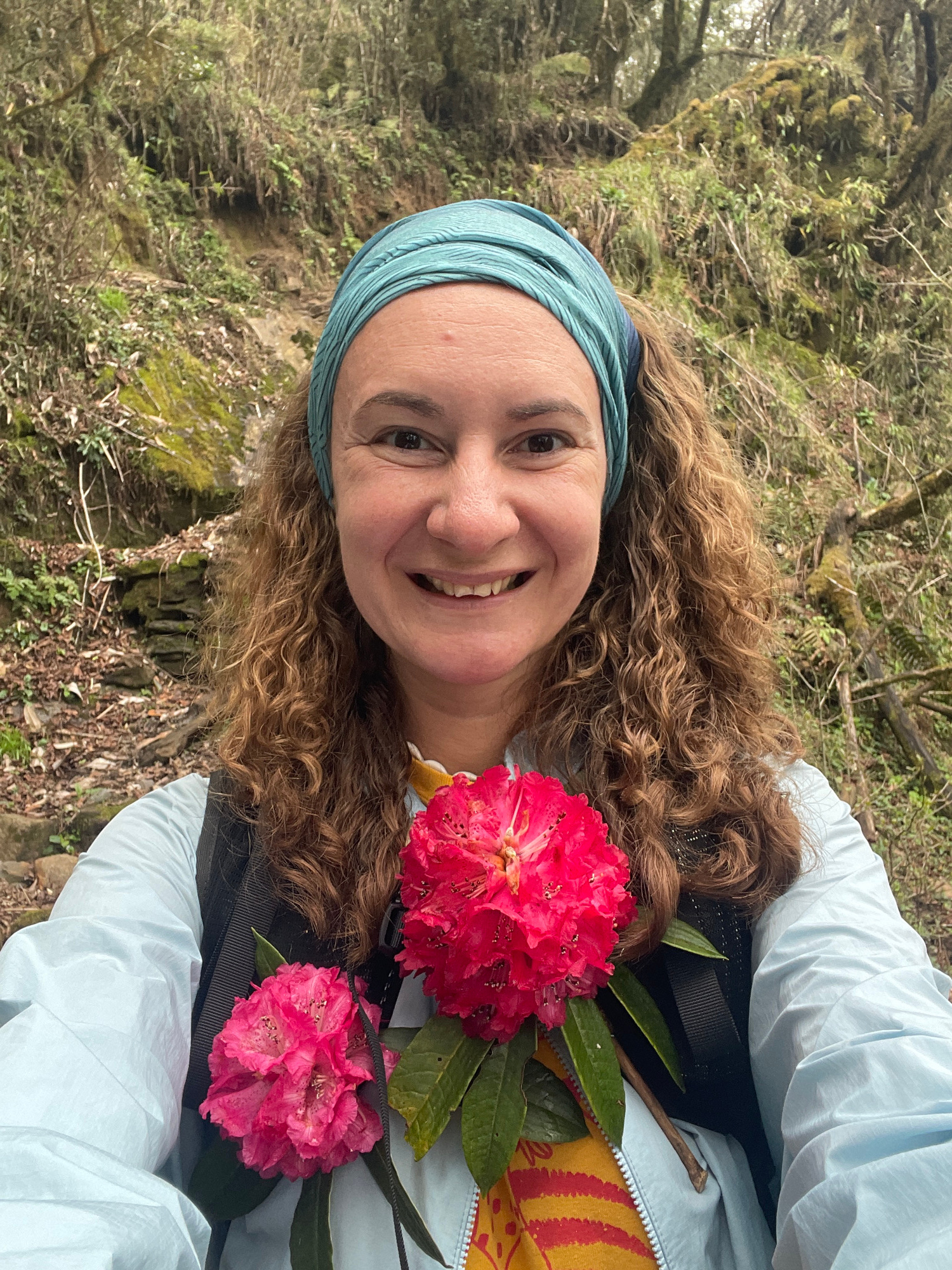A smiling woman is photographed in a selfie, showcasing red rhododendron flowers tucked into her clothing. She wears a light blue headband and jacket over a patterned shirt. Her curly hair is partiall…read more