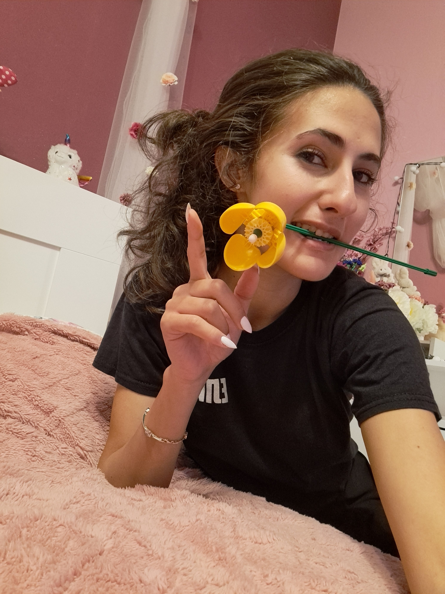 A young woman is lying on a pink bed with a white headboard, inside what appears to be a bedroom. She is holding a yellow plastic flower in her mouth, the stem of which extends vertically. She is poin…read more
