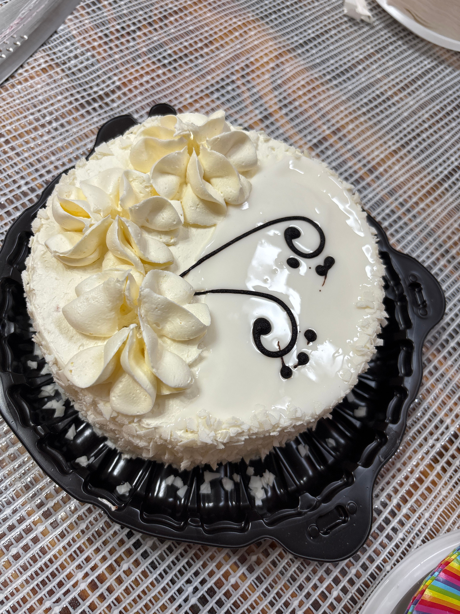 A whole, round, two-layer cake rests in a black plastic carrier. The cake has white frosting with a glossy glaze on top, decorated with black piped designs resembling abstract floral elements. Large r…read more