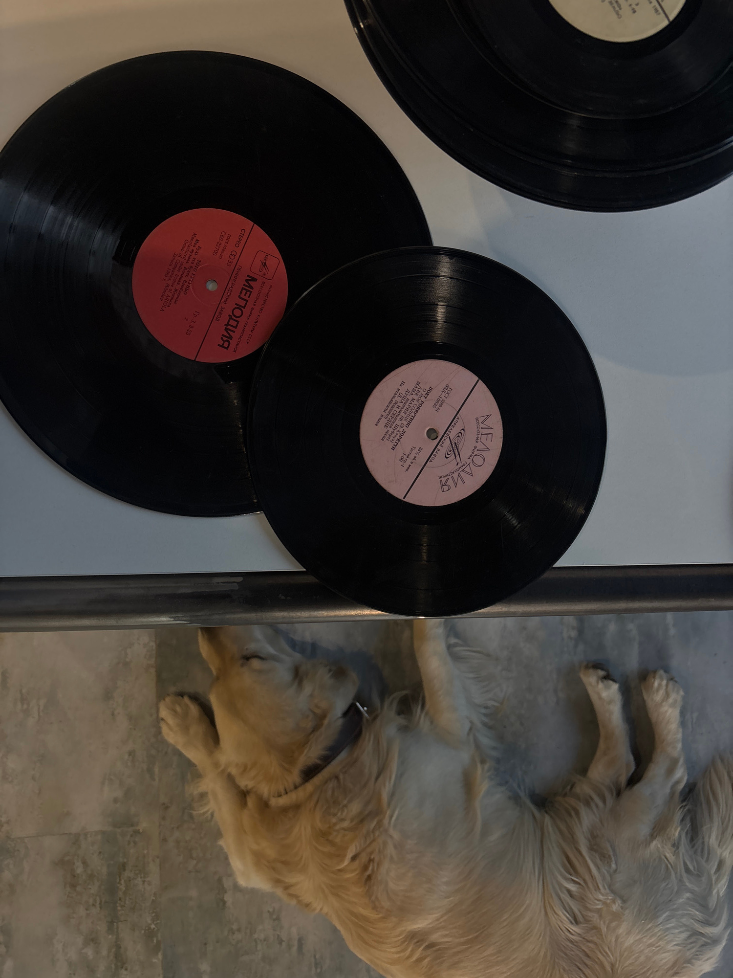 The image shows a golden retriever dog lying on a gray floor next to a shelf or surface that holds three vinyl records. The records are black and have labels with text in Russian, including the word "…read more