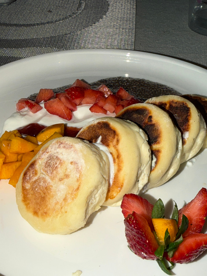 A white, oval-rimmed plate containing a food presentation is centered on a dark grey, circular-patterned placemat. The scene is described as being in Tel-Aviv, Israel. The plate holds a horizontal rowβ¦read more