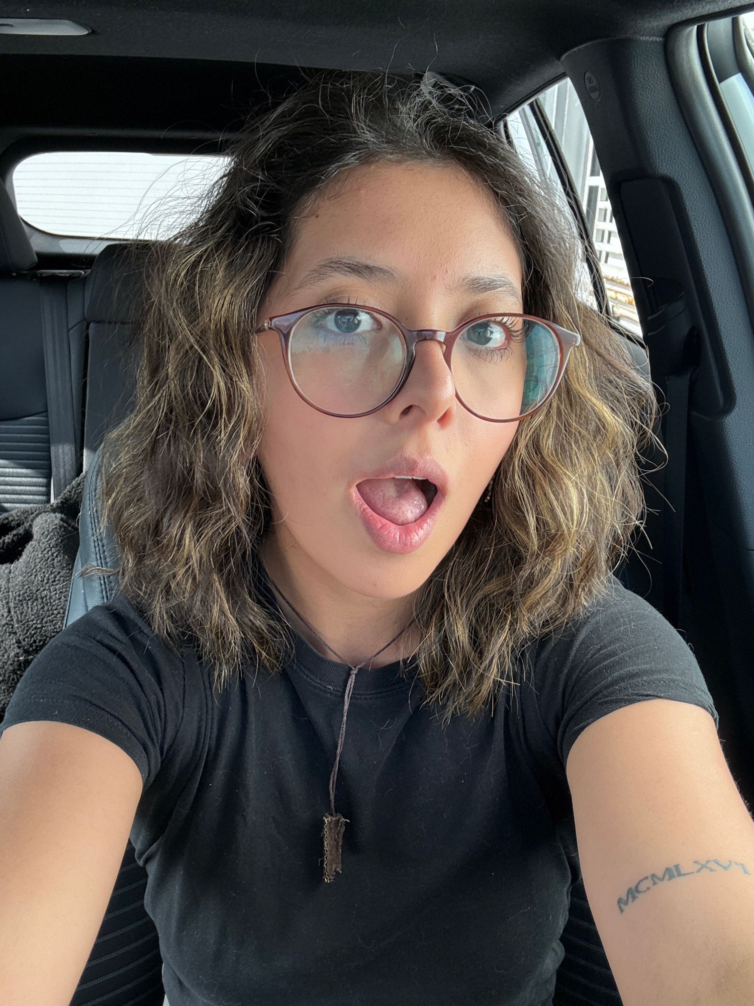 A person wearing glasses and a dark shirt is in a car. The location is Puebla, Mexico. The person has a tattoo on their arm. The person's mouth is open. The car's interior is visible.