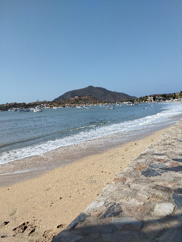 A serene coastal scene showcases a sandy beach, the waves gently lapping at the shore. In the distance, a verdant mountain dominates the horizon, dotted with buildings at its peak. Several boats are a…read more