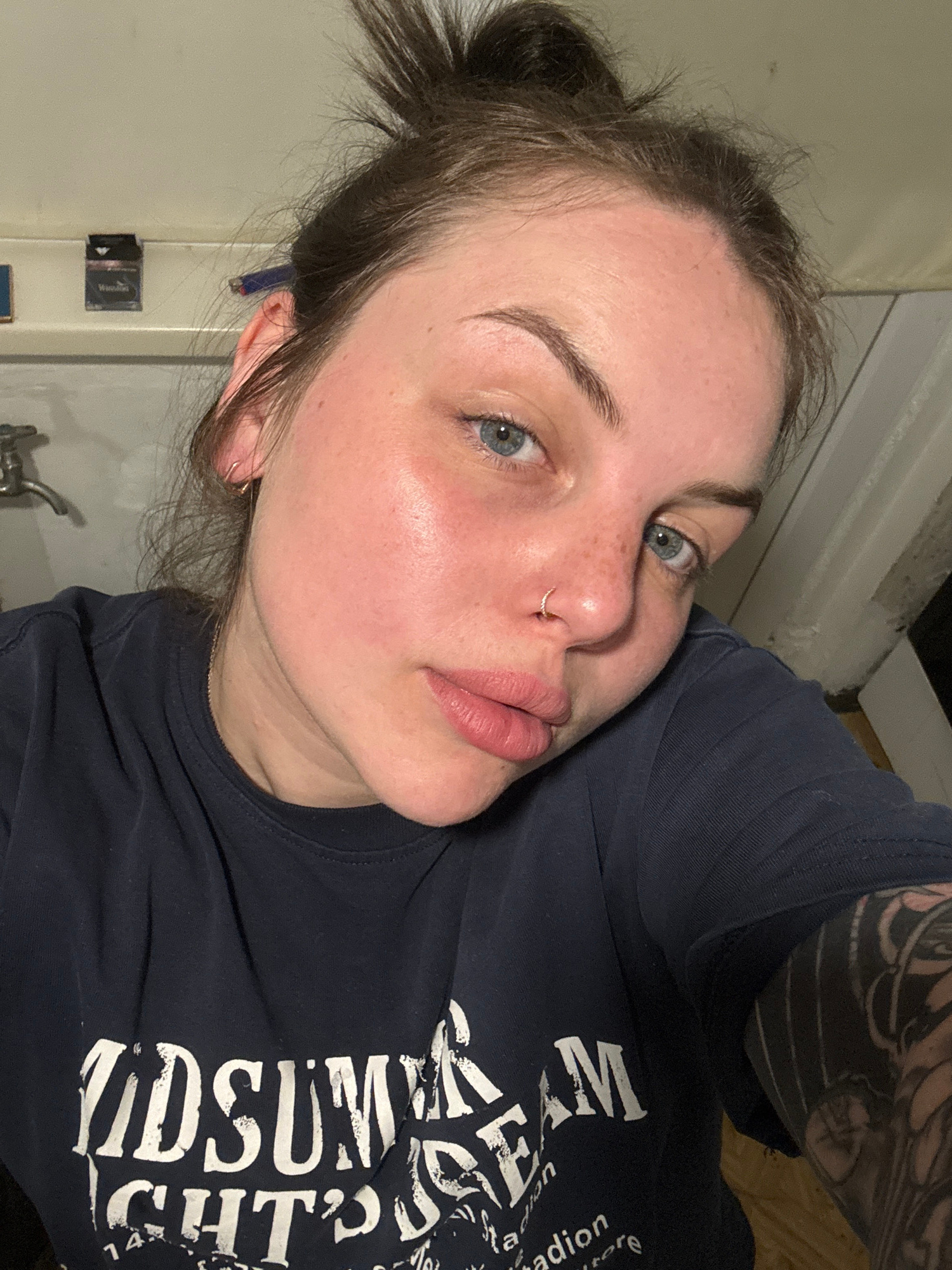 A woman with fair skin, light blue eyes, and brown hair pulled back in a bun is shown in a close-up, selfie-style photograph. She has a nose ring in her left nostril and is wearing a dark navy-blue T-…read more