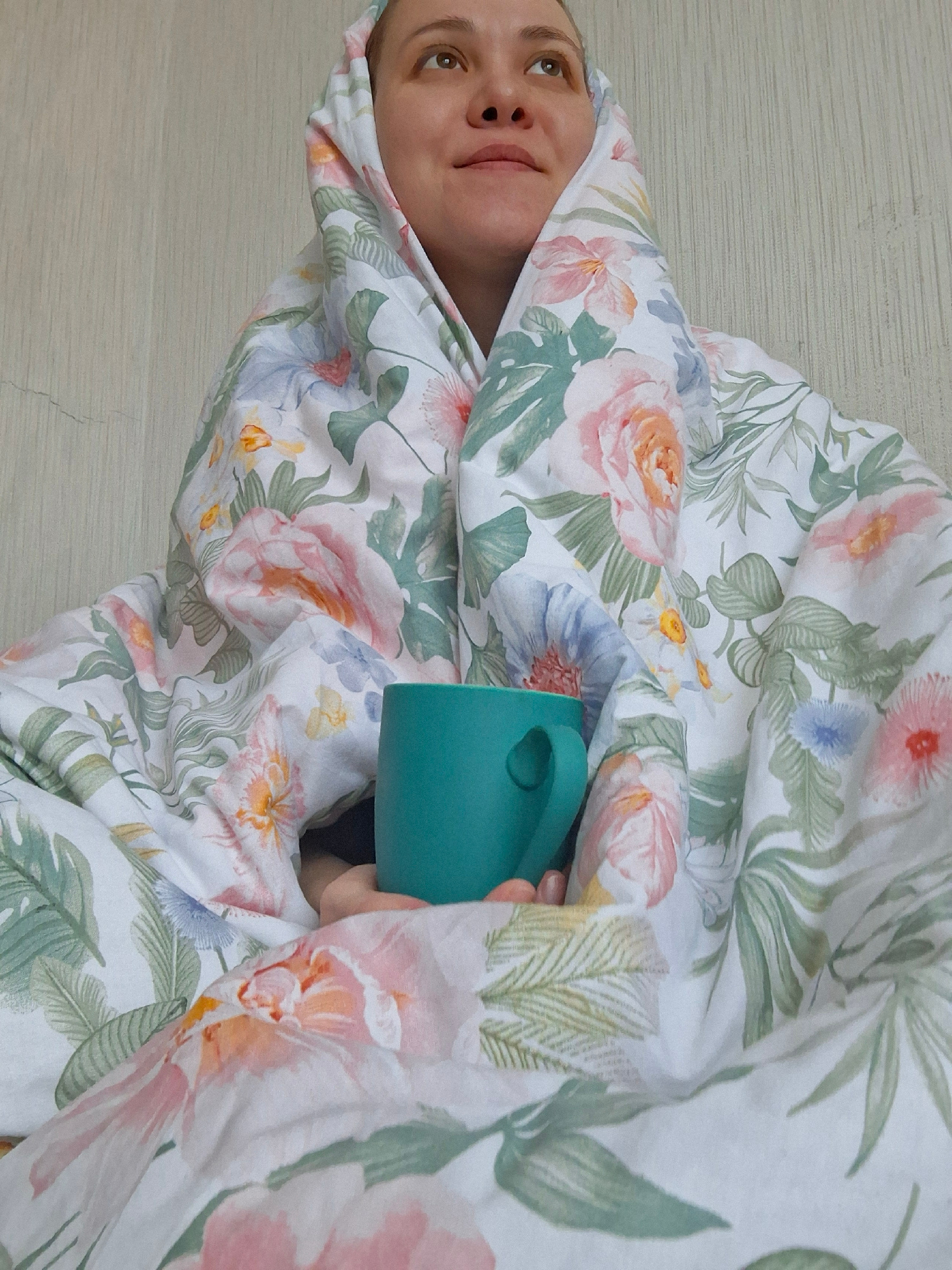 A woman is wrapped in floral-patterned bedding while holding a green mug. The bedding is predominantly white, with pink, orange, and blue flowers, as well as green leaves. The woman's face is visible…read more