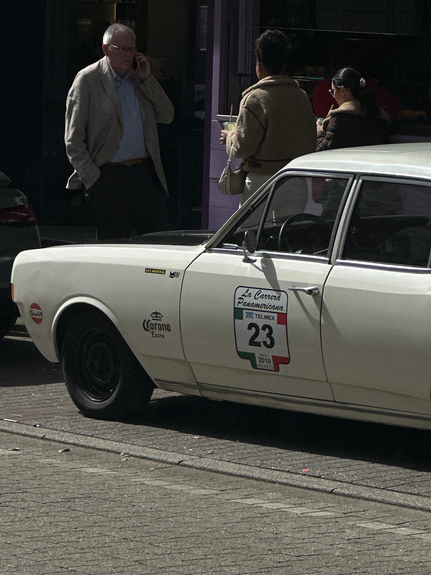 The image shows a vintage white car parked on a paved street. The car displays racing decals, including "La Carrera Panamericana," the number "23," and sponsors like "Corona Extra" and "Gulf." A man i…read more