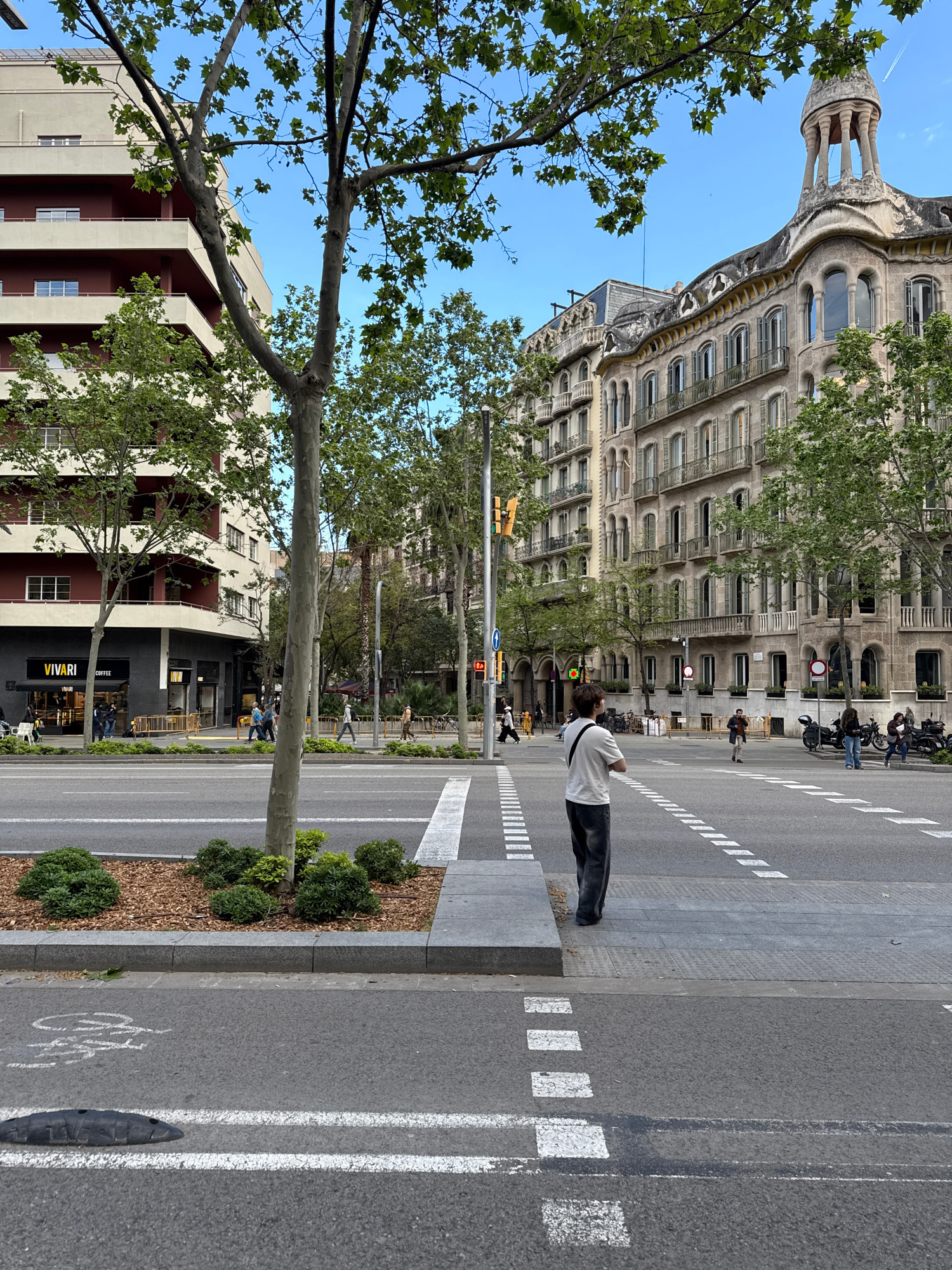 A medium-shot photograph depicts a street scene in Barcelona, Spain, featuring a pedestrian standing on the sidewalk at a crosswalk. The man has dark hair and is wearing a white shirt and dark pants.…read more