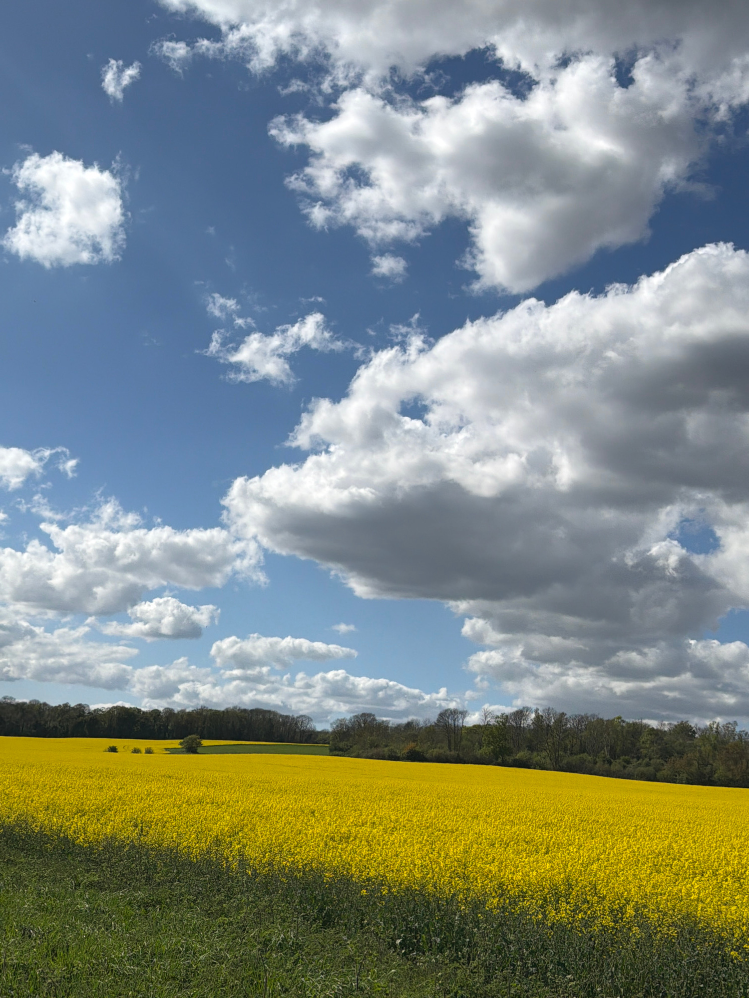 The image shows a field of bright yellow rapeseed flowers under a blue sky with puffy white clouds. The field is bordered by a line of trees. The scene is likely located in the countryside near Maidst…read more