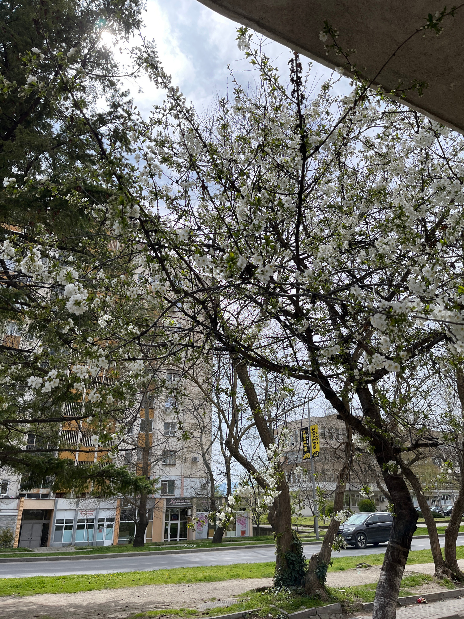 The image shows a tree in full bloom with white flowers, obscuring the view of a street scene in Karlovo, Bulgaria. Buildings of light colors with visible windows and balconies stand along the street.…read more
