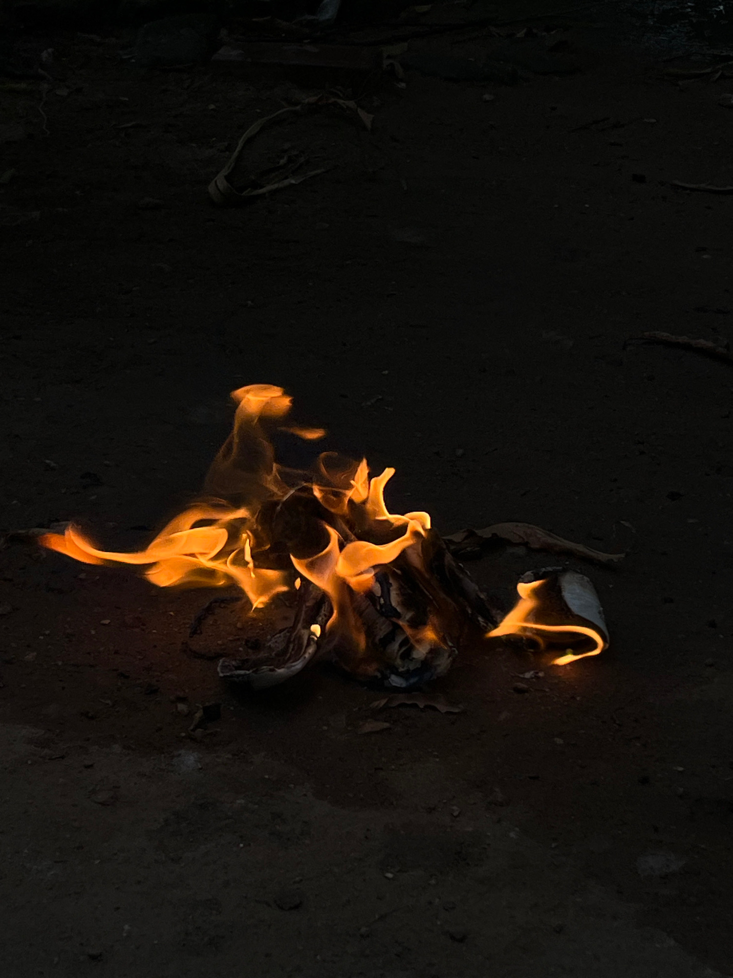 The image shows a small fire burning on the ground. The ground appears to be made of dirt or dark soil. The fire is small, with orange and yellow flames licking at the edges of what appears to be a bu…read more