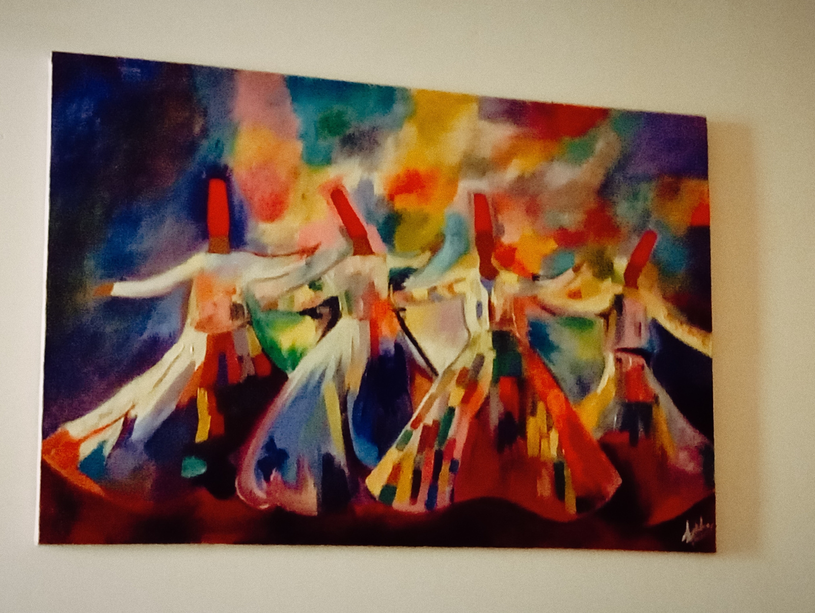 The image is a painting depicting four figures that appear to be Sufi whirling dervishes. The figures are depicted in long, flowing white gowns with colorful accents, and red conical hats. Their arms…read more