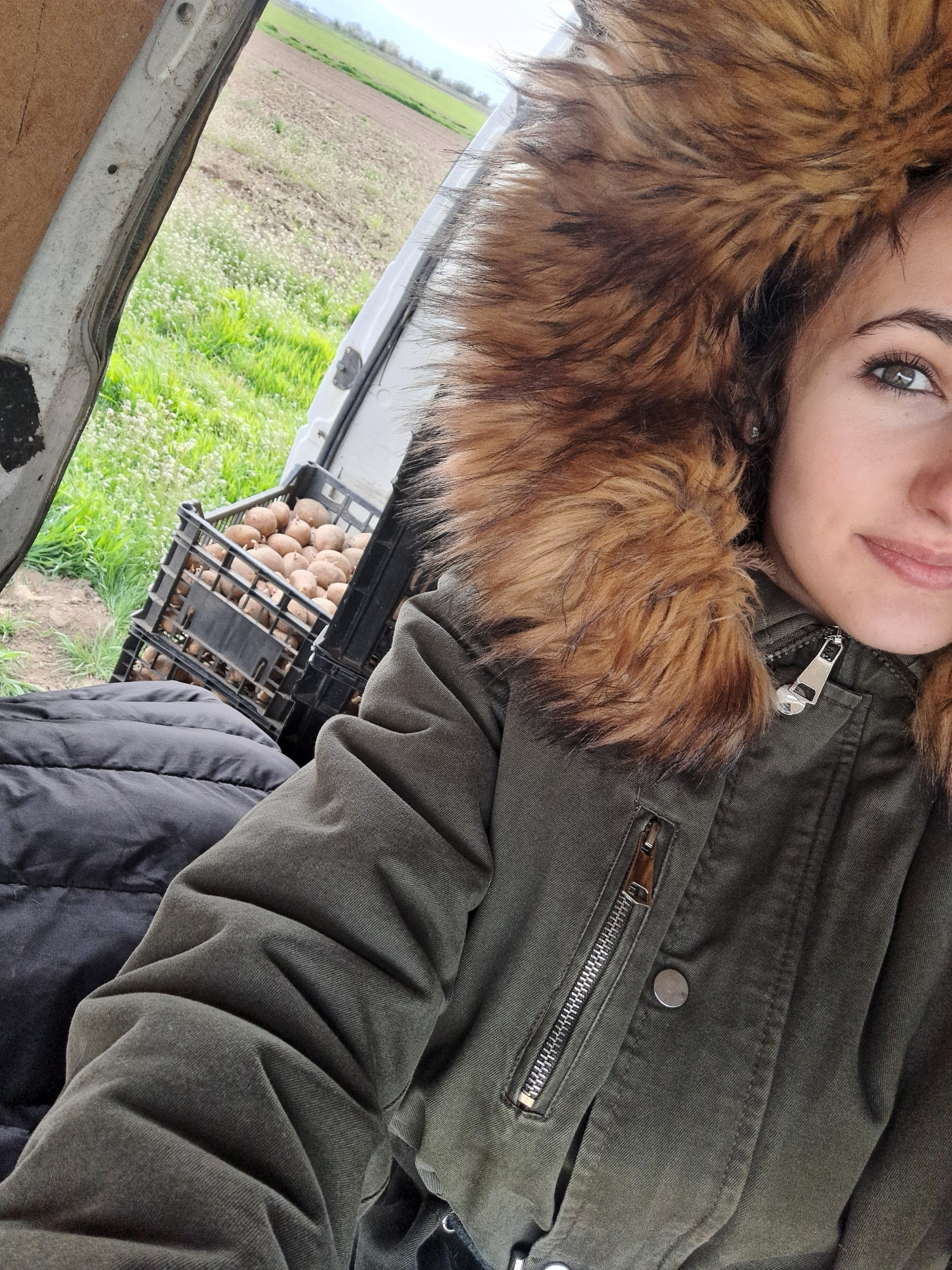 A young woman with fair skin and dark hair, wearing a green parka with a fur-trimmed hood, is inside a vehicle, possibly a van. The view outside the vehicle shows a field with green grass and some wil…read more