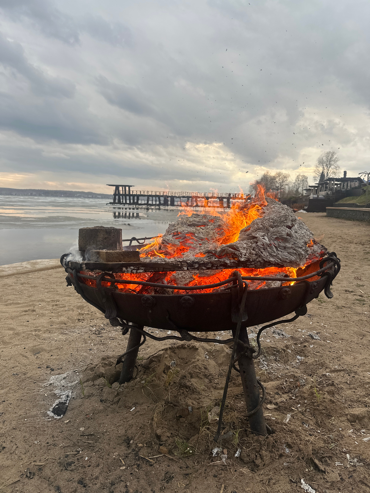 A metal fire pit stands on a sandy area, filled with burning material and flames. In the background, there is a body of water with a wooden pier extending into it. On the opposite shore, there is a bu…read more
