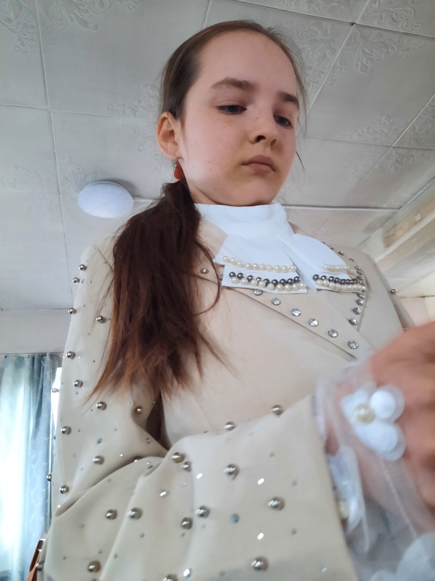 A person with brown hair, gathered in a ponytail, is wearing a light-colored garment adorned with silver studs and pearls, with a white collar. The person is positioned against a tiled wall. The locatβ¦read more