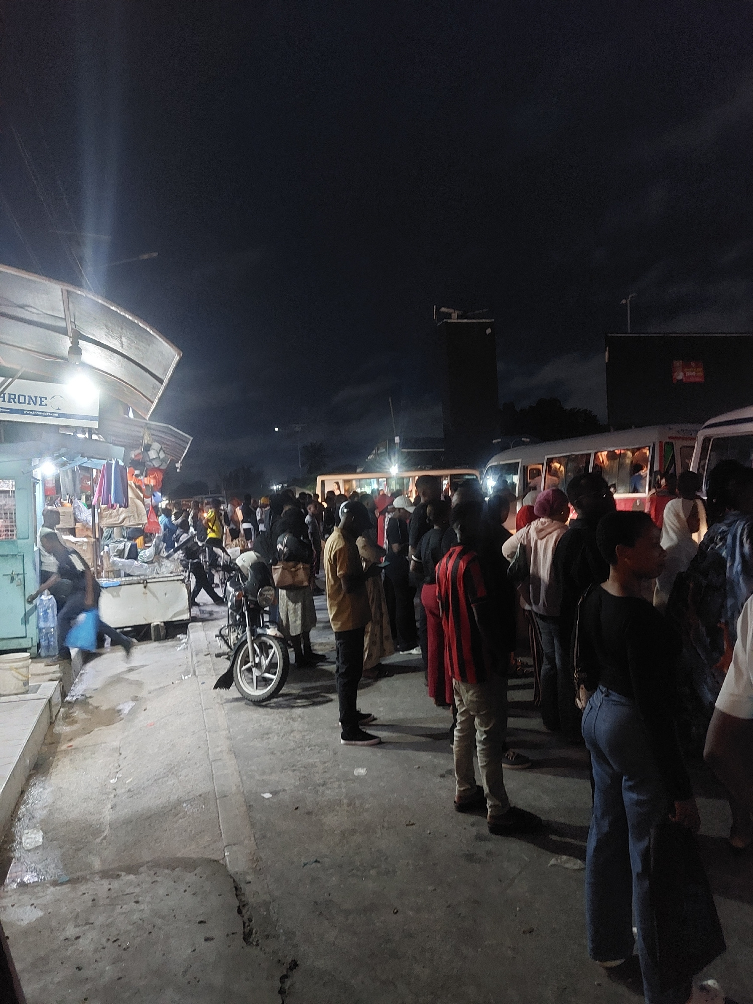 The image depicts a nighttime scene in Dar es-Salaam, Tanzania, likely a bustling street market or transport hub. Several people are boarding or queuing near a minibus, suggesting a public transport s…read more