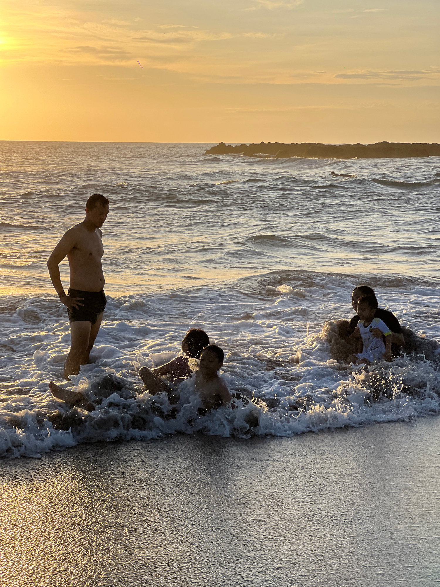 The image captures a group of people enjoying themselves in the surf at a beach in Canggu, Indonesia, likely at sunset. The sky exhibits a gradient of yellow and light orange hues. Closest to the view…read more