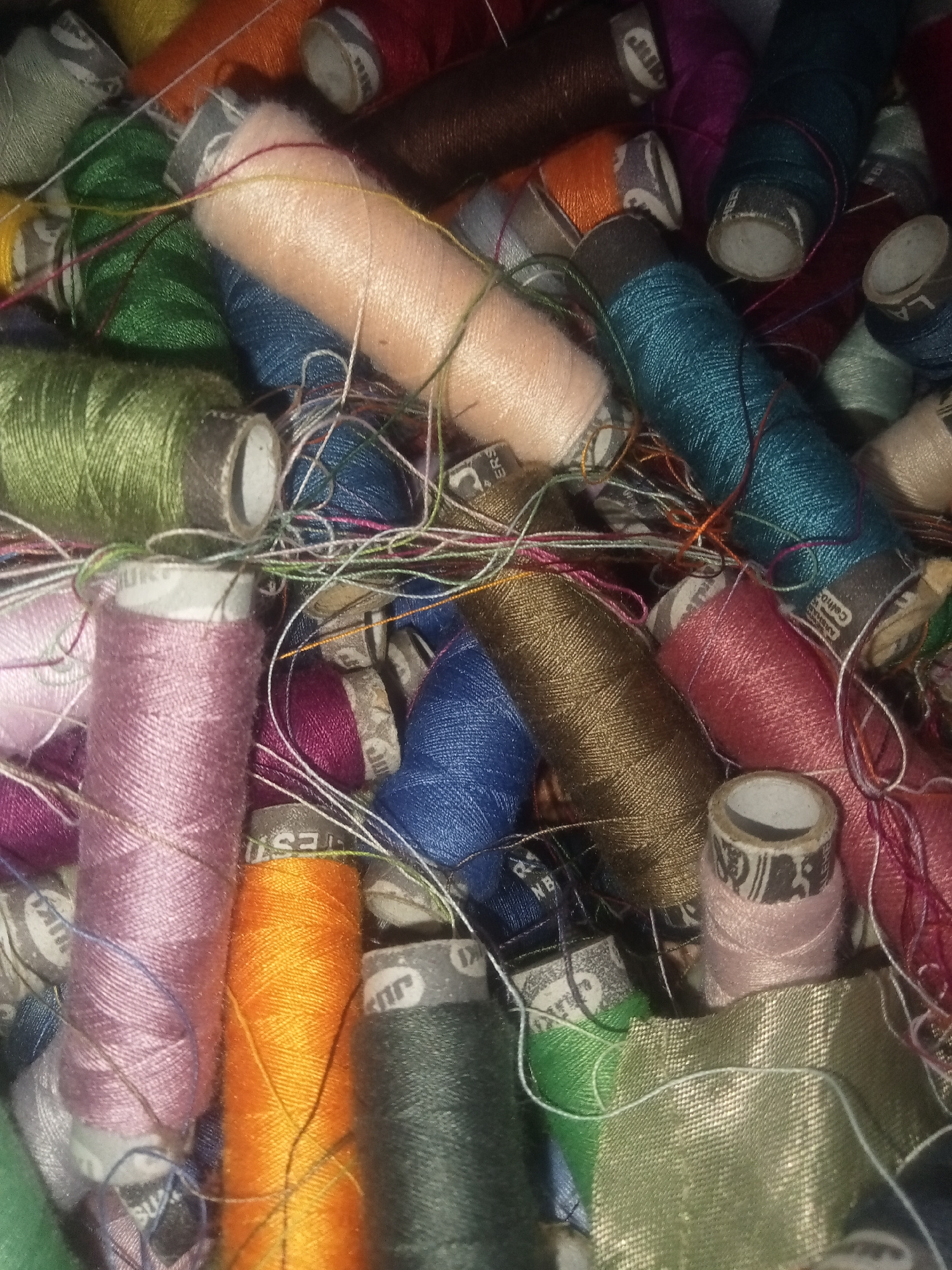 The image shows a close-up, disorganized collection of spools of sewing thread in various colors. The threads are wound on cardboard and plastic spools. The spools include a range of hues including pi…read more