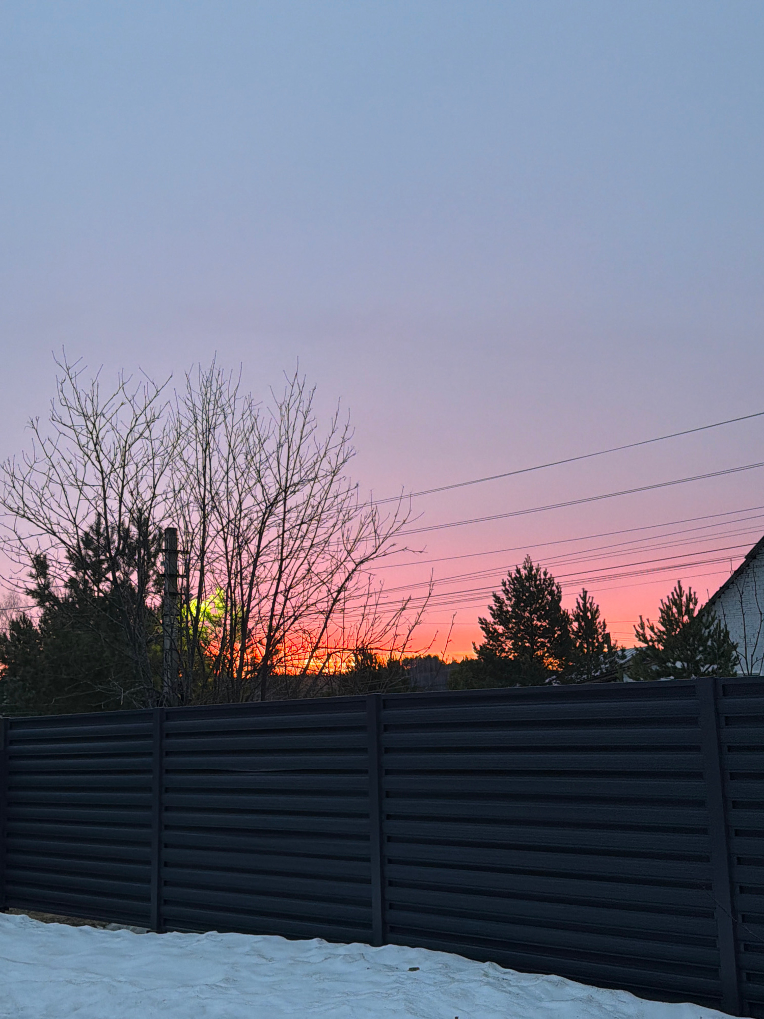 The image depicts a sunset over a landscape featuring trees, power lines, a dark corrugated metal fence, and a snow-covered surface. The sky transitions from a light blue-gray to pink and orange hues…read more