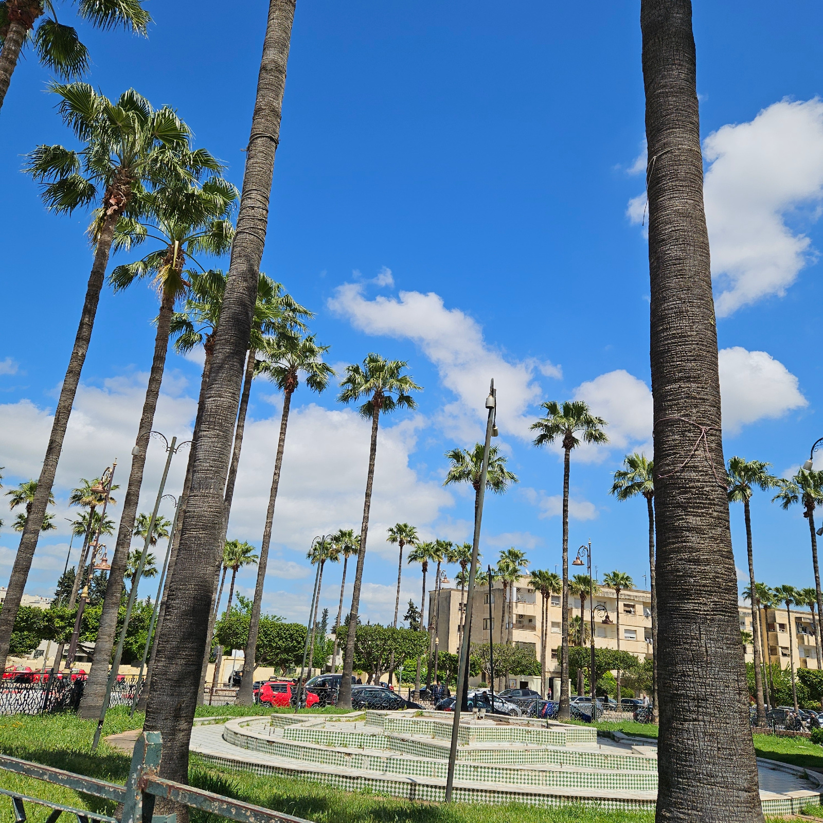 This is a photograph taken in Fez, Morocco. A long row of palm trees lines a street. A building sits on the other side of the road. Cars are parked on the street, and a few people are visible in the dā¦read more