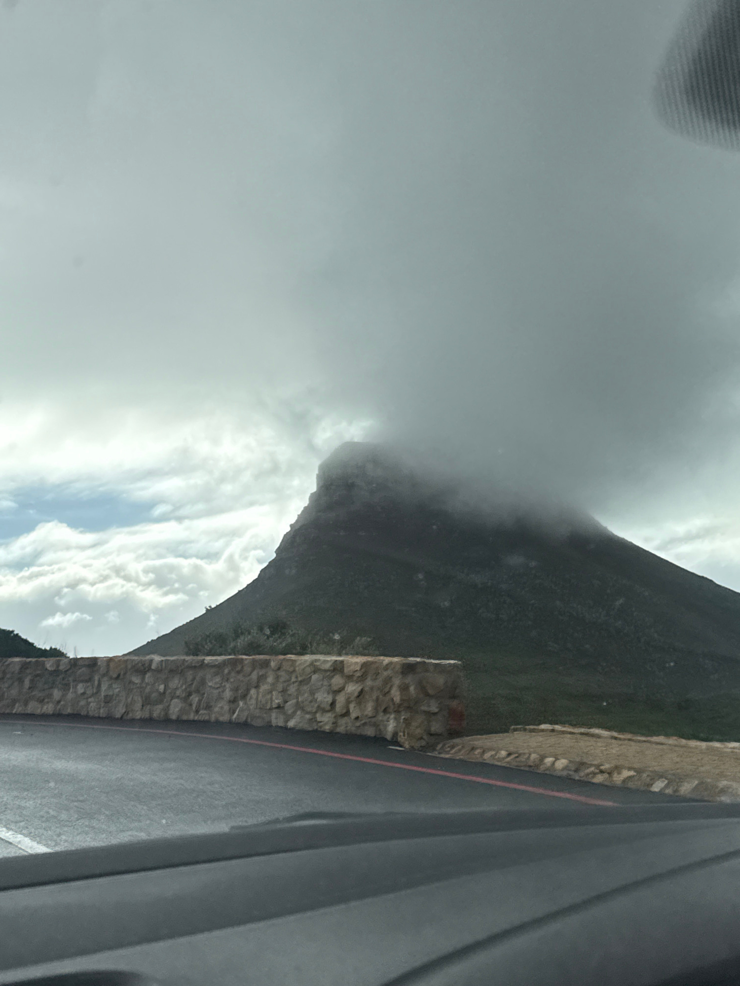 This landscape image, likely captured from inside a vehicle, presents a majestic mountain range partially enveloped in thick clouds or fog. The mountain, dark green and steep, dominates the right side…read more