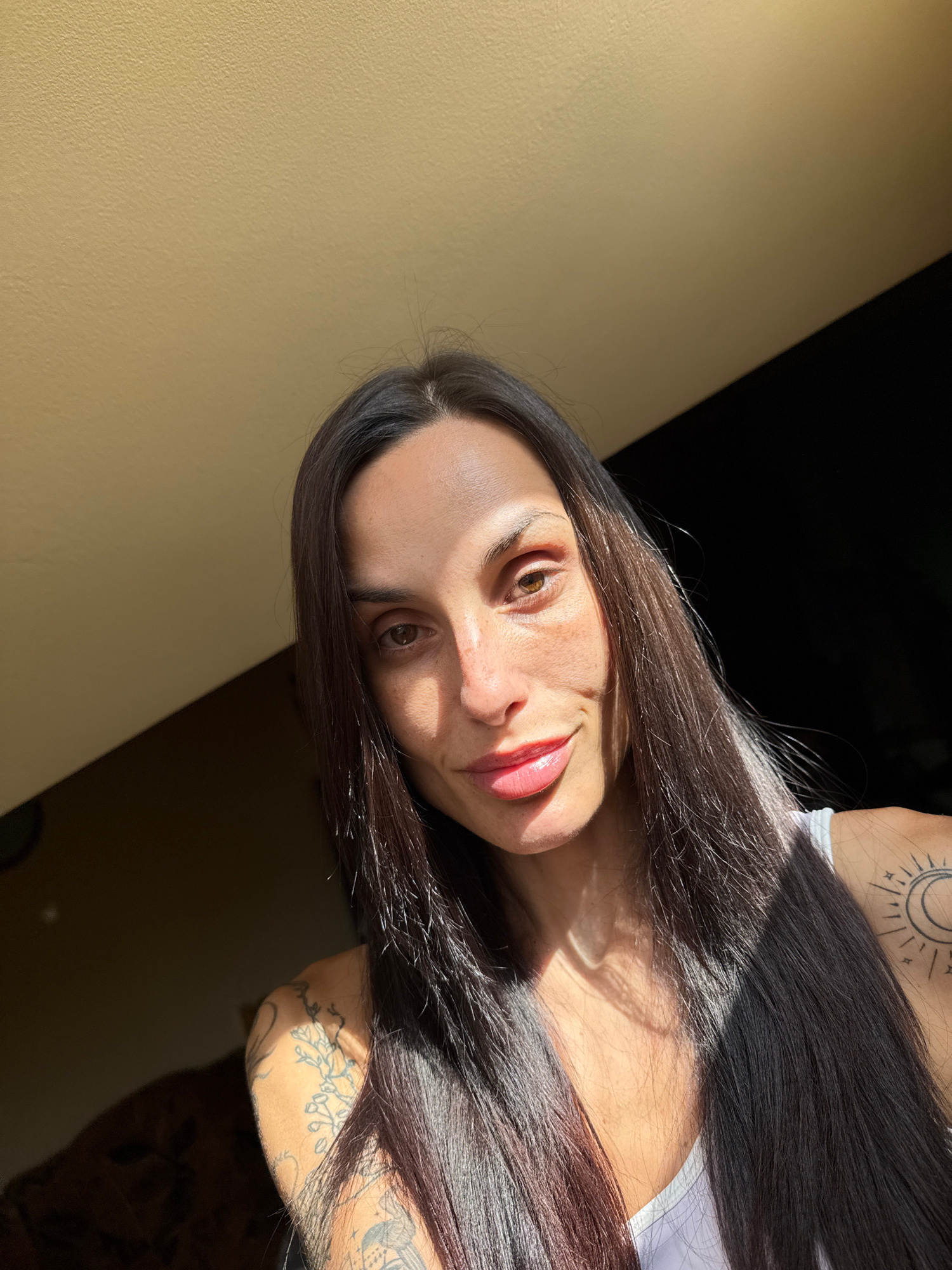 This media file presents a close-up portrait of a woman. She has long, dark, straight hair, which is illuminated by strong, direct sunlight. Her face is turned slightly towards the viewer, featuring l…read more