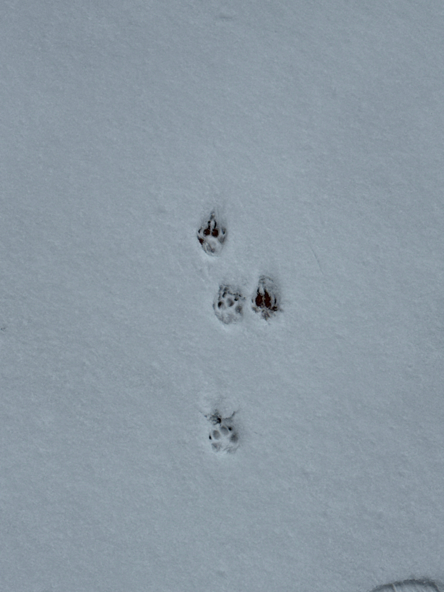 The image shows three sets of small animal footprints in a light layer of snow. The footprints appear to be close together and somewhat indistinct, suggesting a small animal. There is no immediate ind…read more