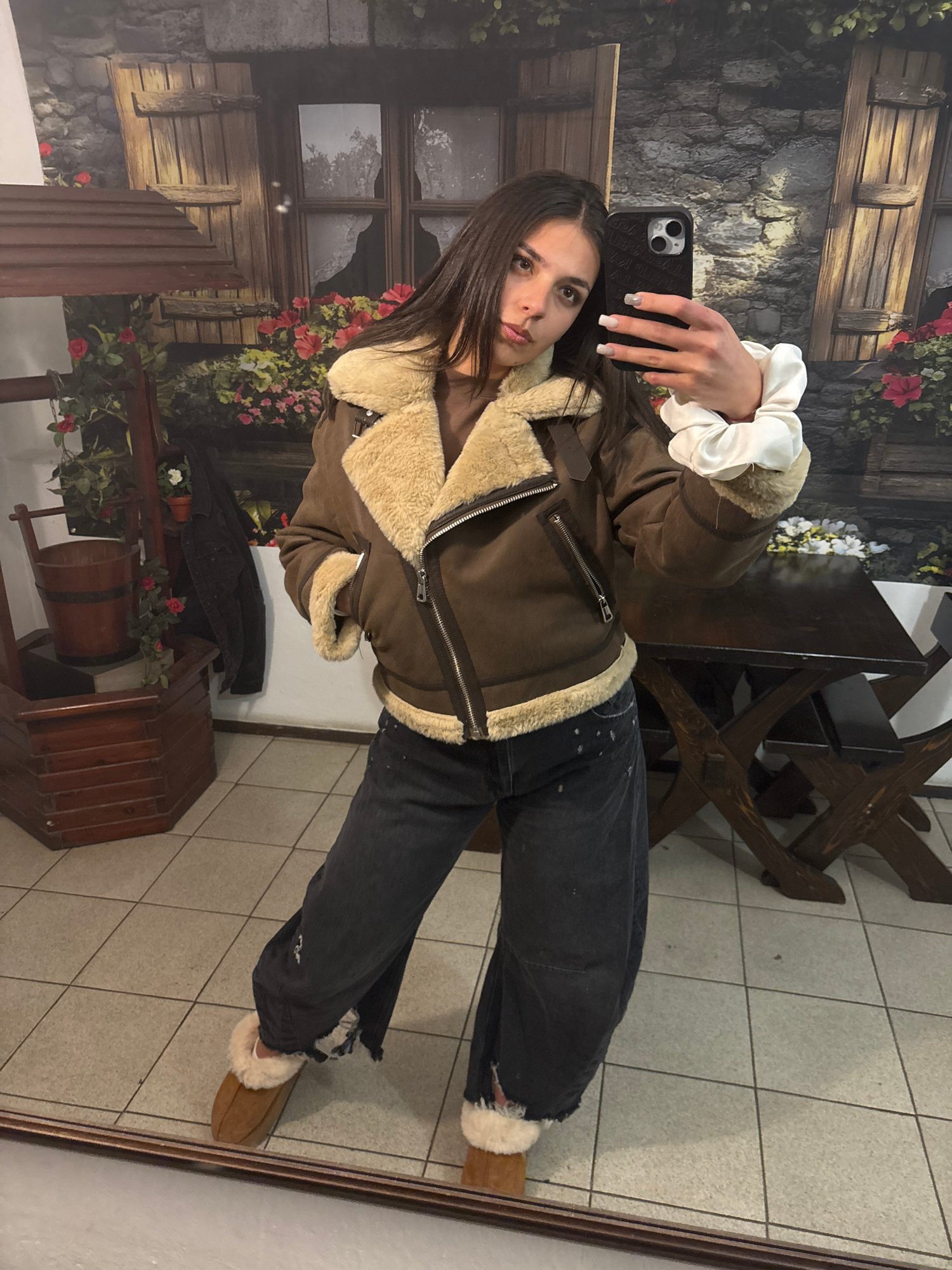 A young woman is taking a selfie in a room with a unique backdrop. She holds a smartphone in her right hand, a white scrunchie around her wrist. She wears a brown aviator-style jacket with a cream-col…read more