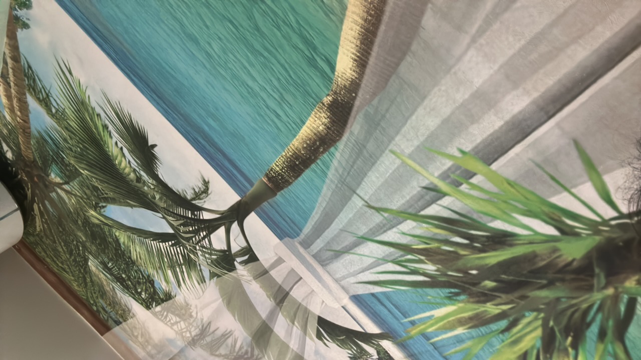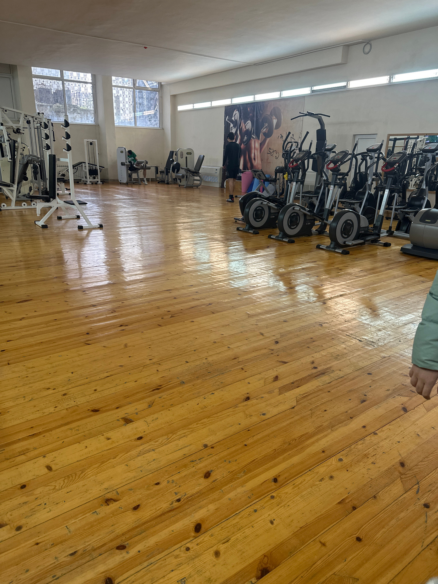 The image shows the interior of a gym with wooden flooring. Exercise equipment, including elliptical machines and weight machines, are arranged along the left side of the room. A mural is visible on t…read more