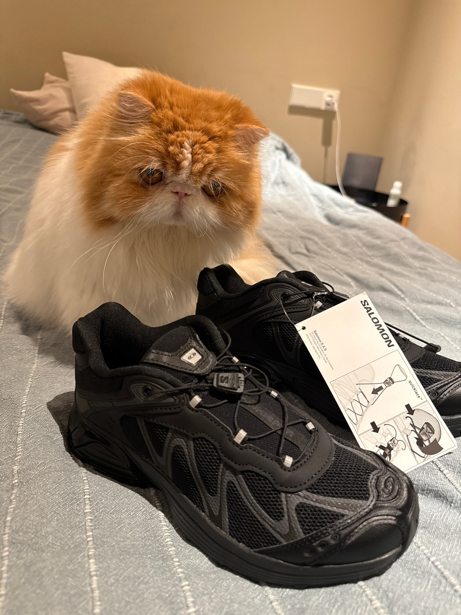 A fluffy orange and white cat is lying on a light gray bedspread beside a pair of black Salomon shoes with the Salomon tag attached. The bedspread has a subtle textured pattern. The background includeβ¦read more