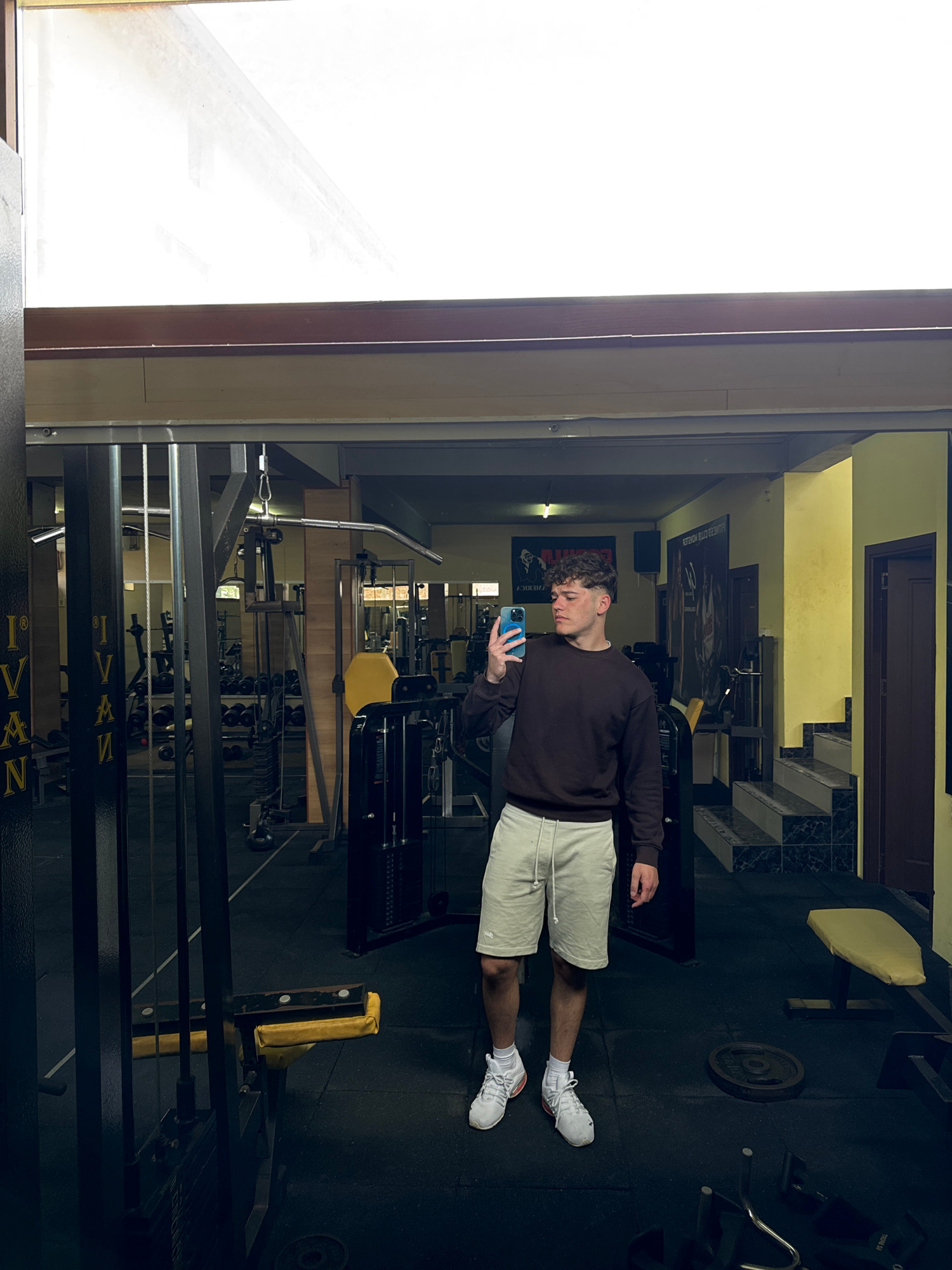 A man in a brown long-sleeved shirt and white shorts is taking a picture of himself with a blue phone in a gym. He is wearing white sneakers. The gym has various exercise machines and equipment, inclu…read more