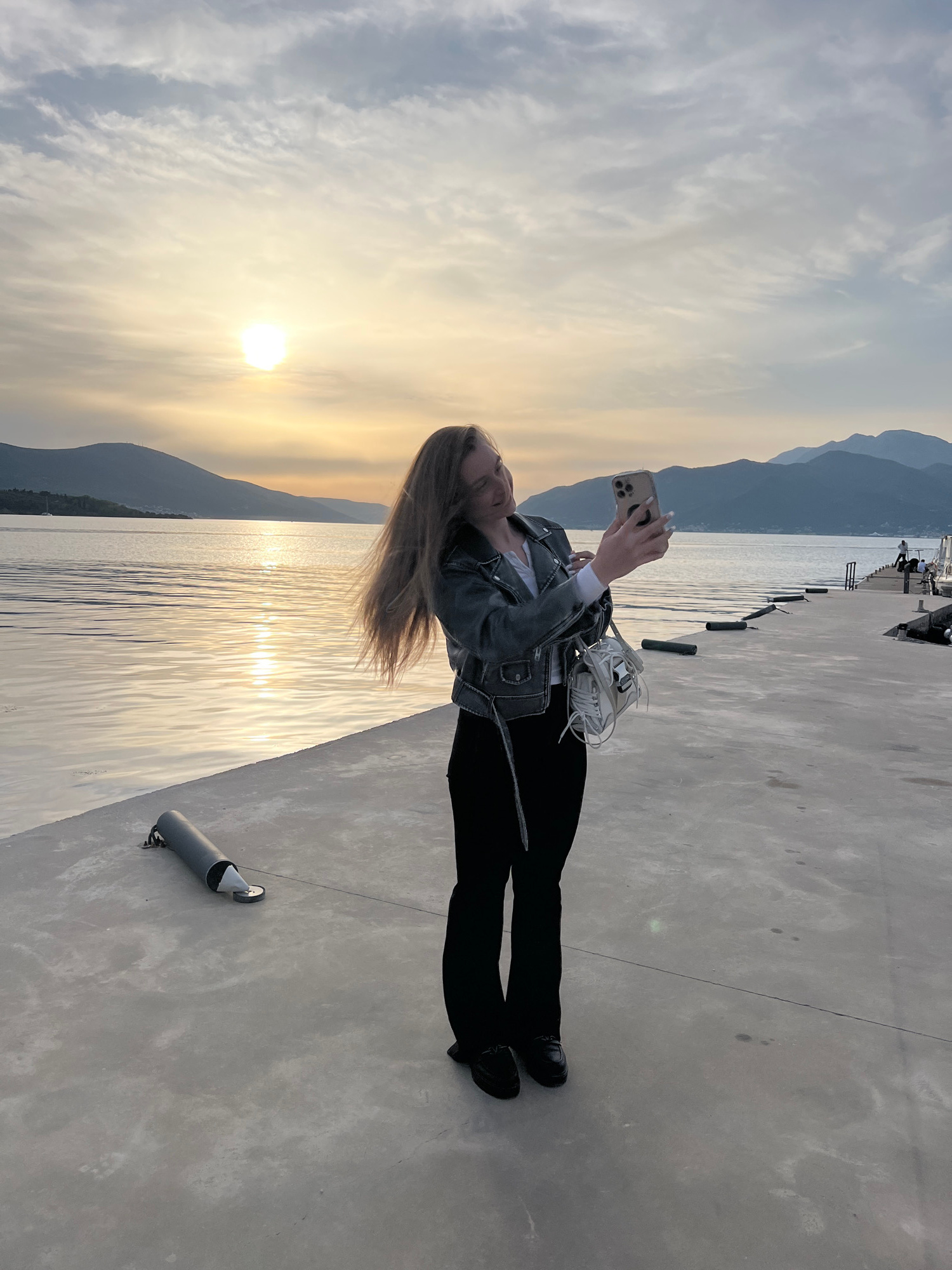 A woman is standing on a concrete pier in Tivat, Montenegro. She is holding a phone and taking a picture of the sunset over the water. She is wearing a denim jacket, a white shirt, and black pants. Sh…read more