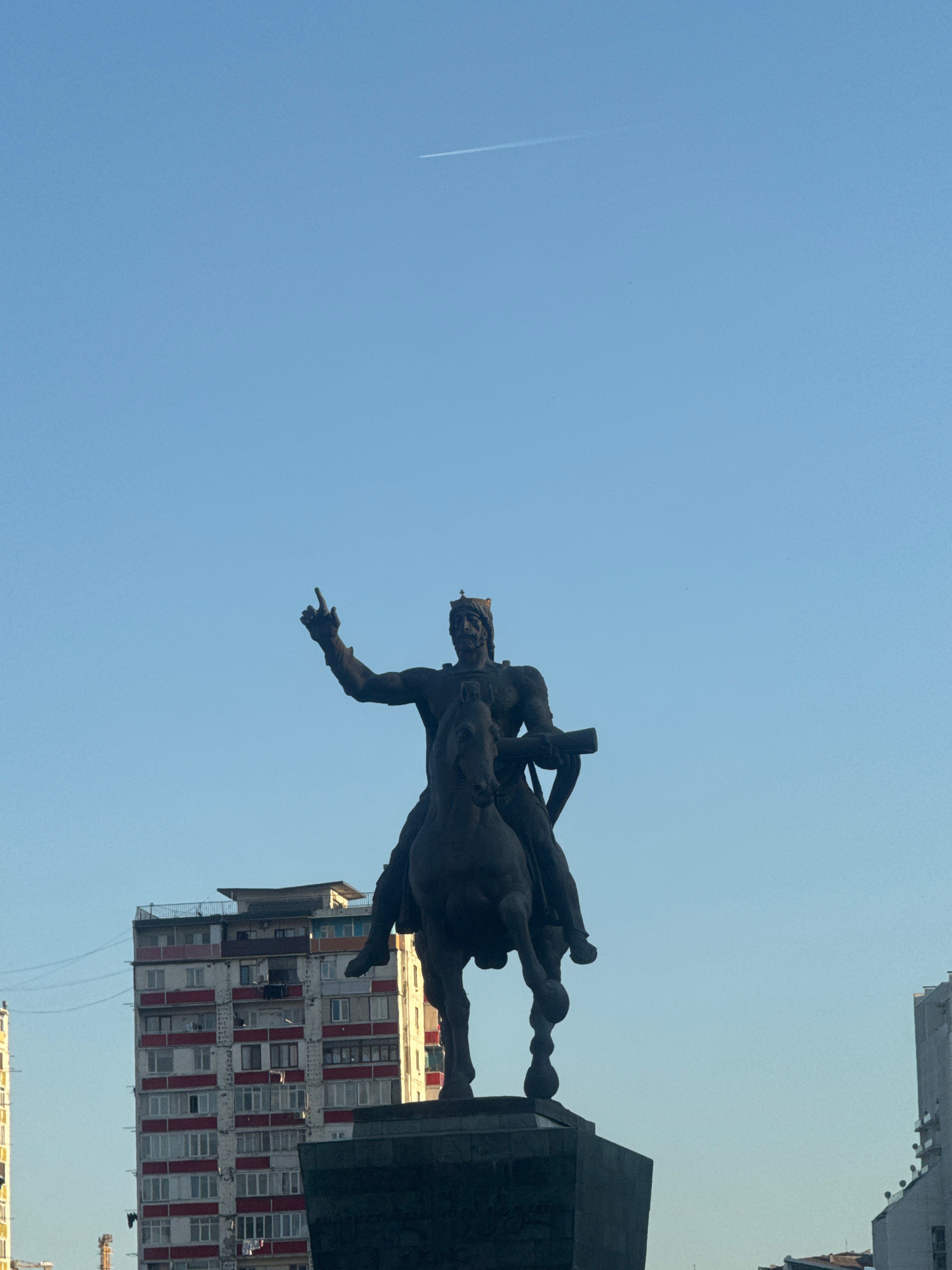 An upward-angled, daytime photograph features a prominent equestrian statue against a clear, bright blue sky in what is identified as Tbilisi, Georgia. The dark, monumental statue depicts a crowned ma…read more