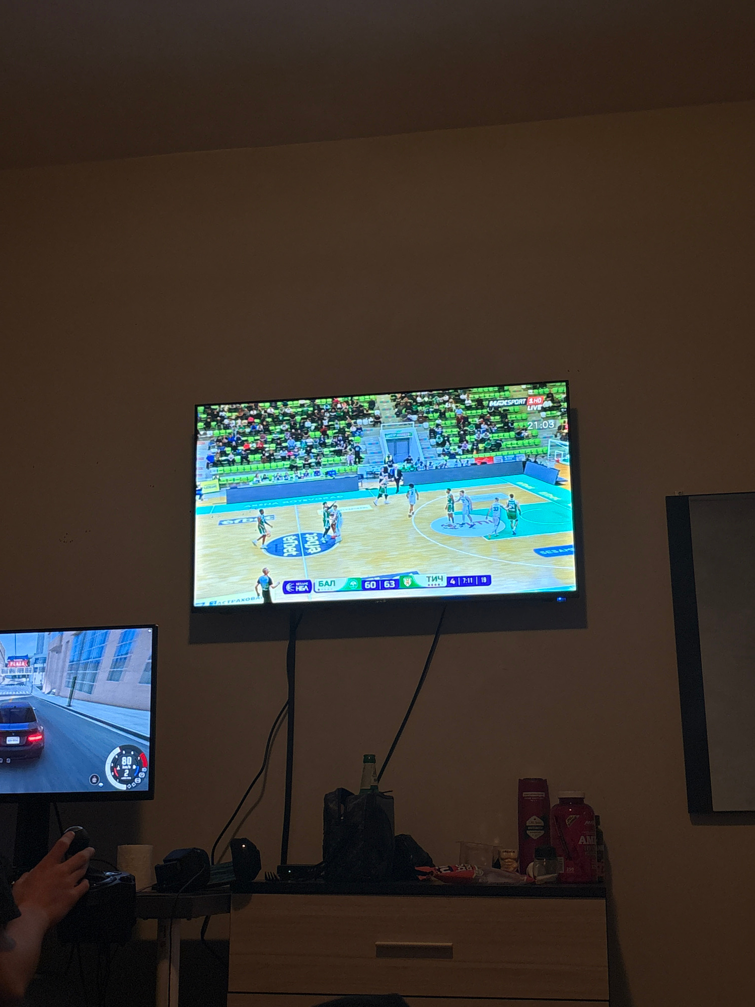 The image shows a wall with two screens mounted on it. The upper screen displays a basketball game, recognizable by the court and players. The lower screen shows a driving game, as seen by the dashboa…read more