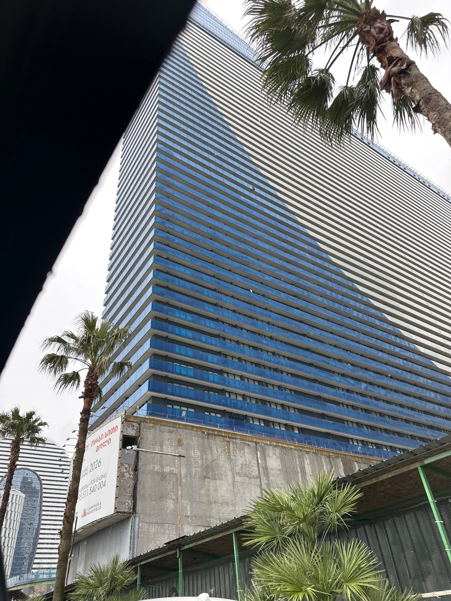 The image shows a modern skyscraper in Batumi, Georgia. The building features a striped facade with alternating panels of reflective blue glass and white material. Palm trees frame the building from e…read more