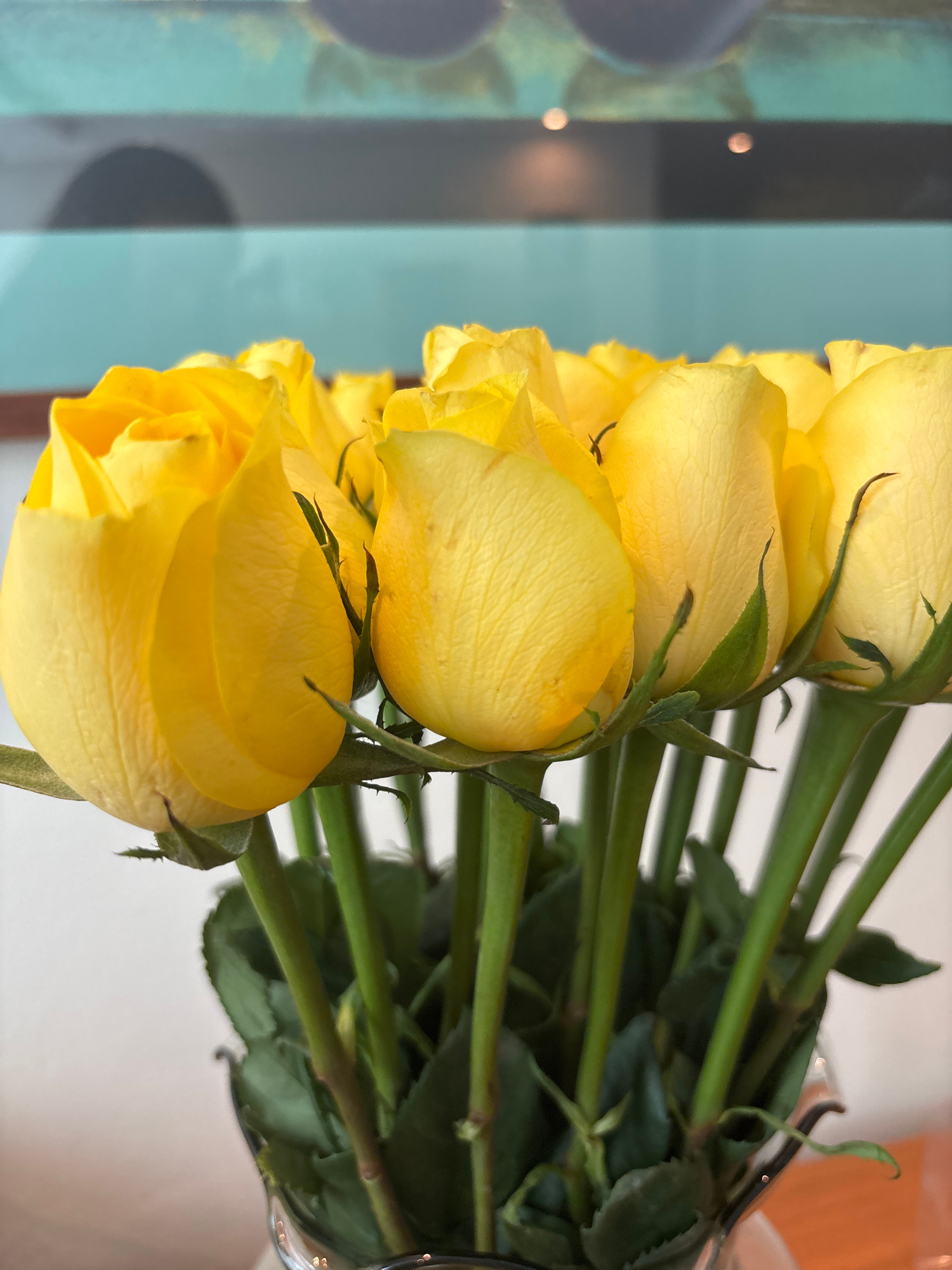 A bouquet of yellow roses rests on a reflective surface, possibly glass, in Jesús del Monte, Mexico. The roses are arranged in a line, with their vibrant yellow petals facing left. The stems and green…read more